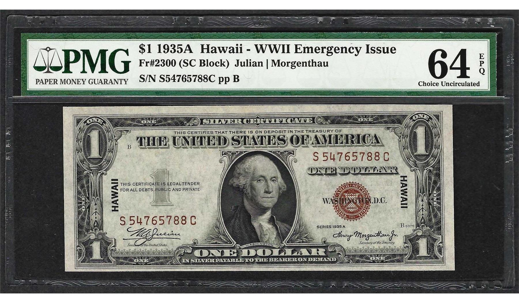 One 1935A $1 Hawaii Silver Certificate WWII Emergency Note PMG Choice Uncirculated 64EPQ. PMG Certified.