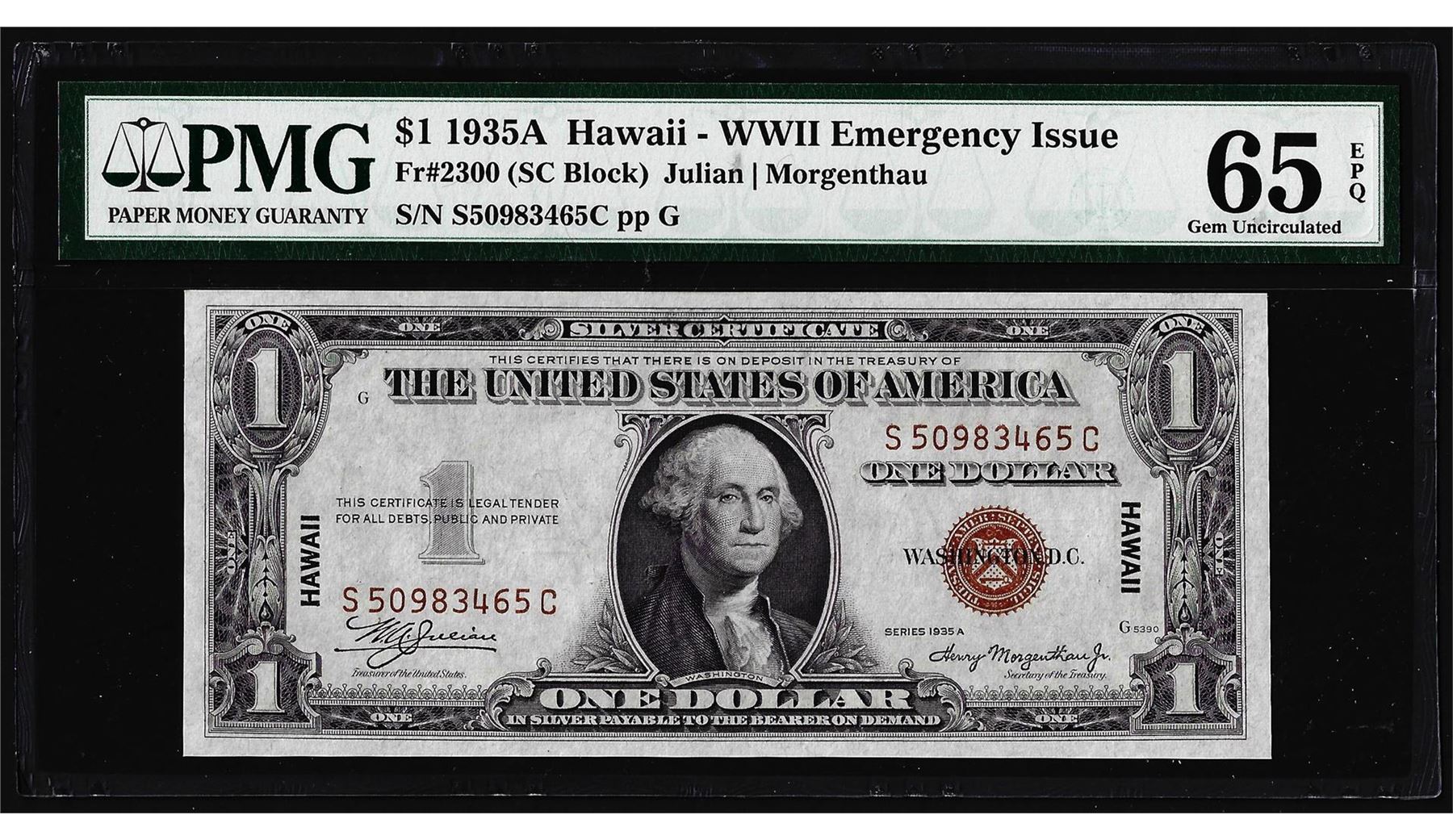 One 1935A $1 Hawaii Silver Certificate WWII Emergency Note PMG Gem Uncirculated 65EPQ. PMG Certified.