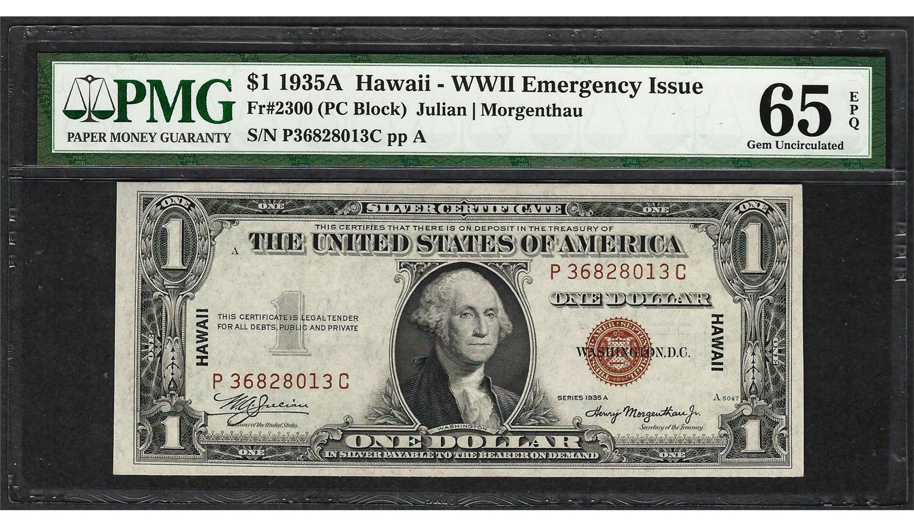 One 1935A $1 Hawaii Silver Certificate WWII Emergency Note PMG Gem Uncirculated 65EPQ. PMG Certified.