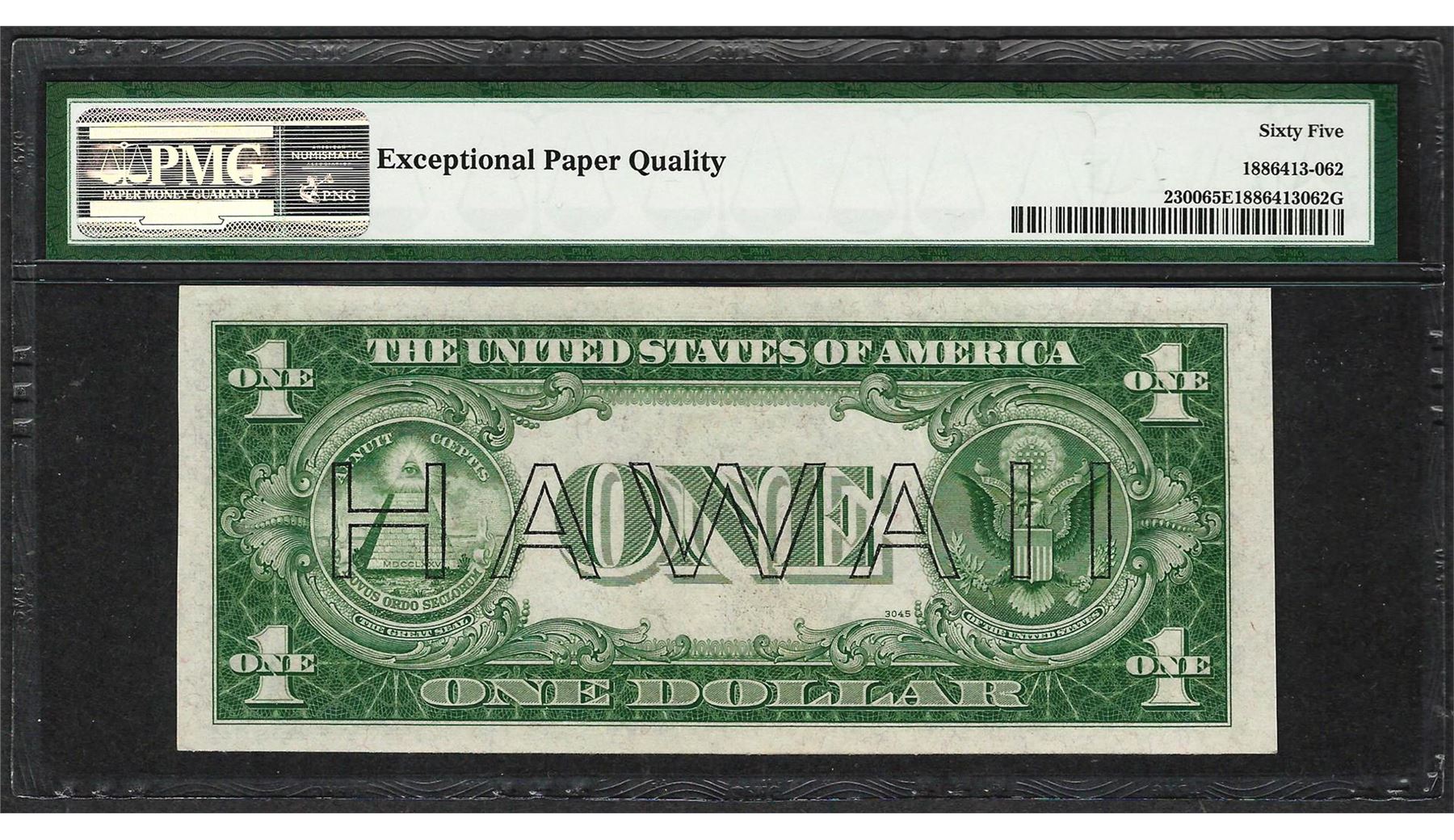 One 1935A $1 Hawaii Silver Certificate WWII Emergency Note PMG Gem Uncirculated 65EPQ. PMG Certified.