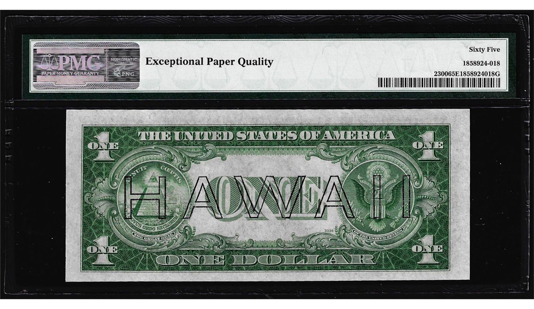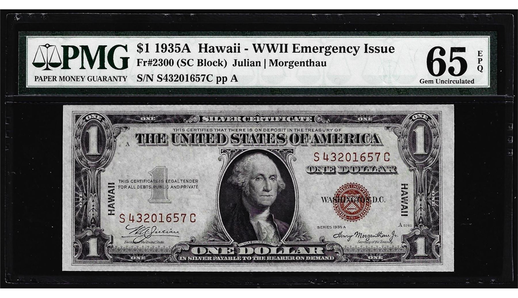 One 1935A $1 Hawaii Silver Certificate WWII Emergency Note PMG Gem Uncirculated 65EPQ. PMG Certified.