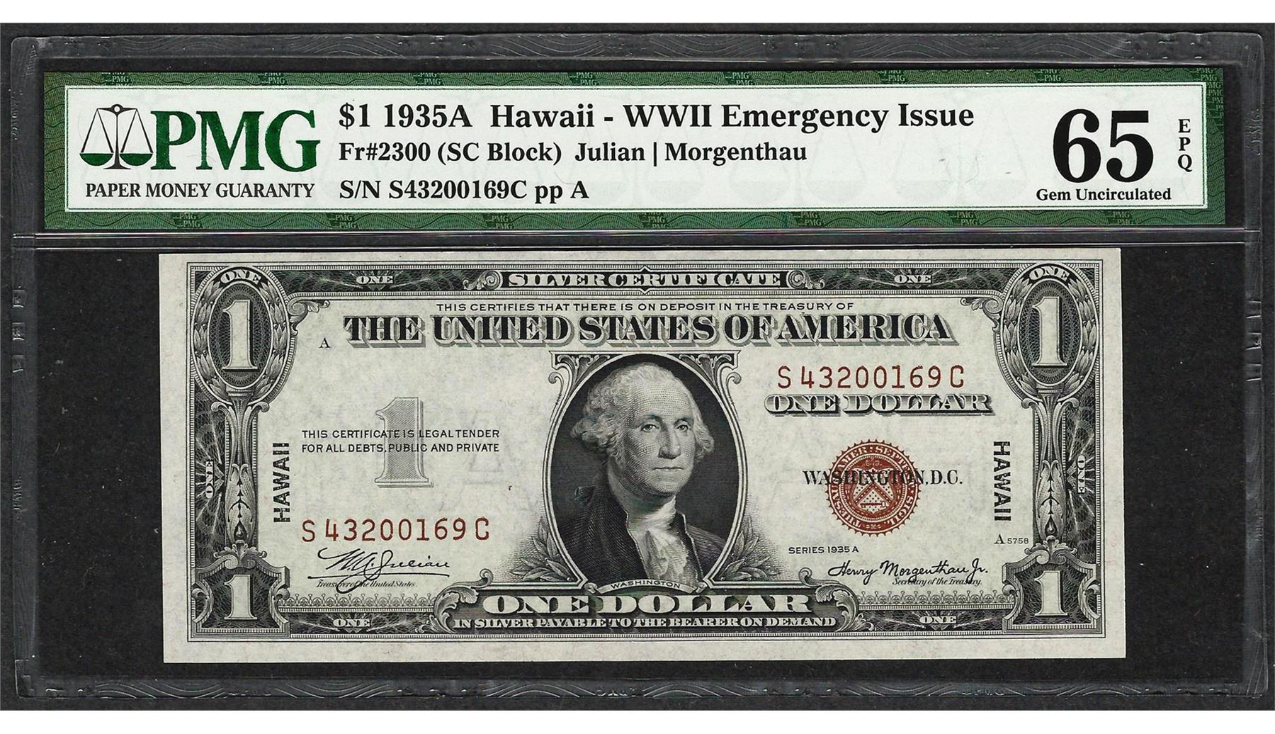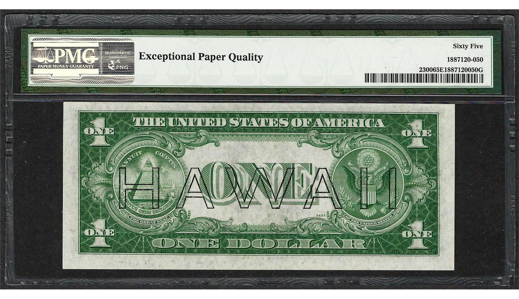 One 1935A $1 Hawaii Silver Certificate WWII Emergency Note PMG Gem Uncirculated 65EPQ. PMG Certified.