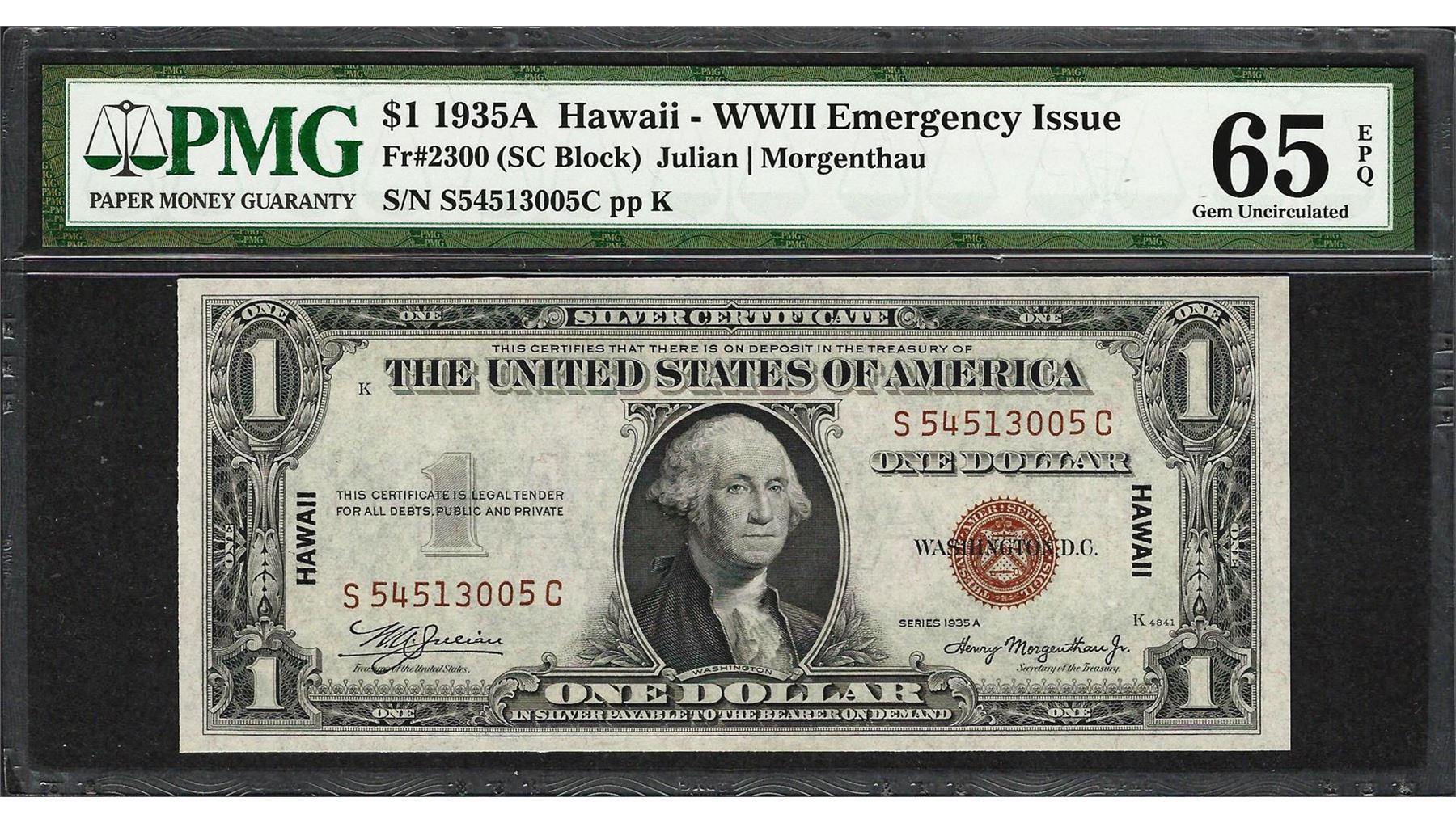 One 1935A $1 Hawaii Silver Certificate WWII Emergency Note PMG Gem Uncirculated 65EPQ. PMG Certified.