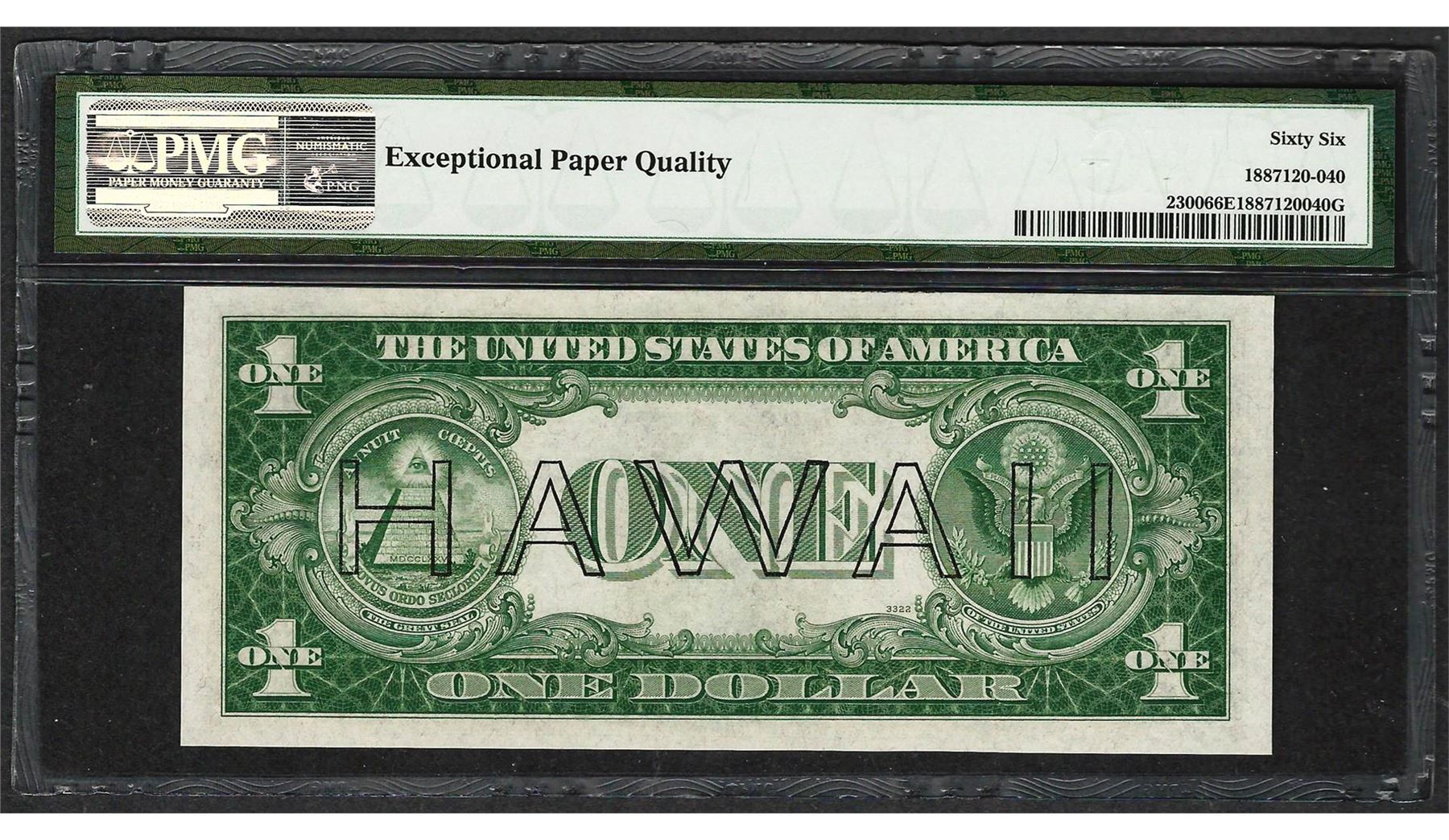One 1935A $1 Hawaii Silver Certificate WWII Emergency Note PMG Gem Uncirculated 66EPQ. PMG Certified.