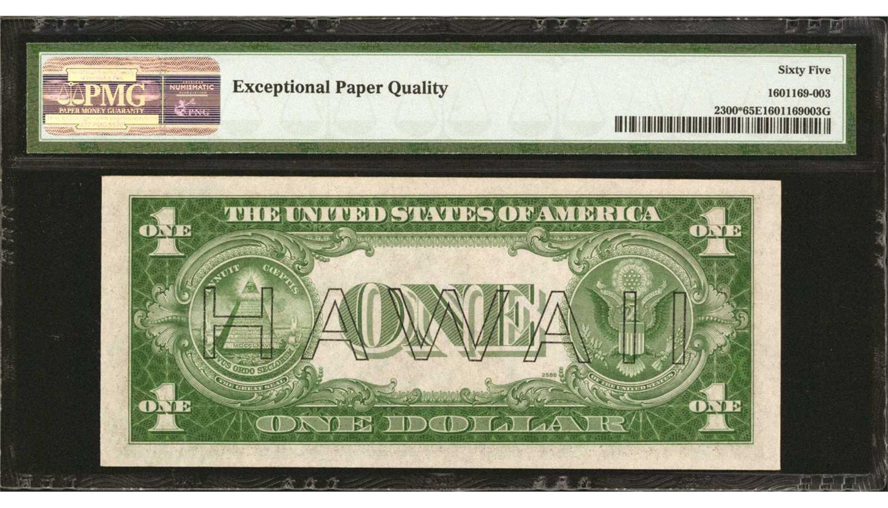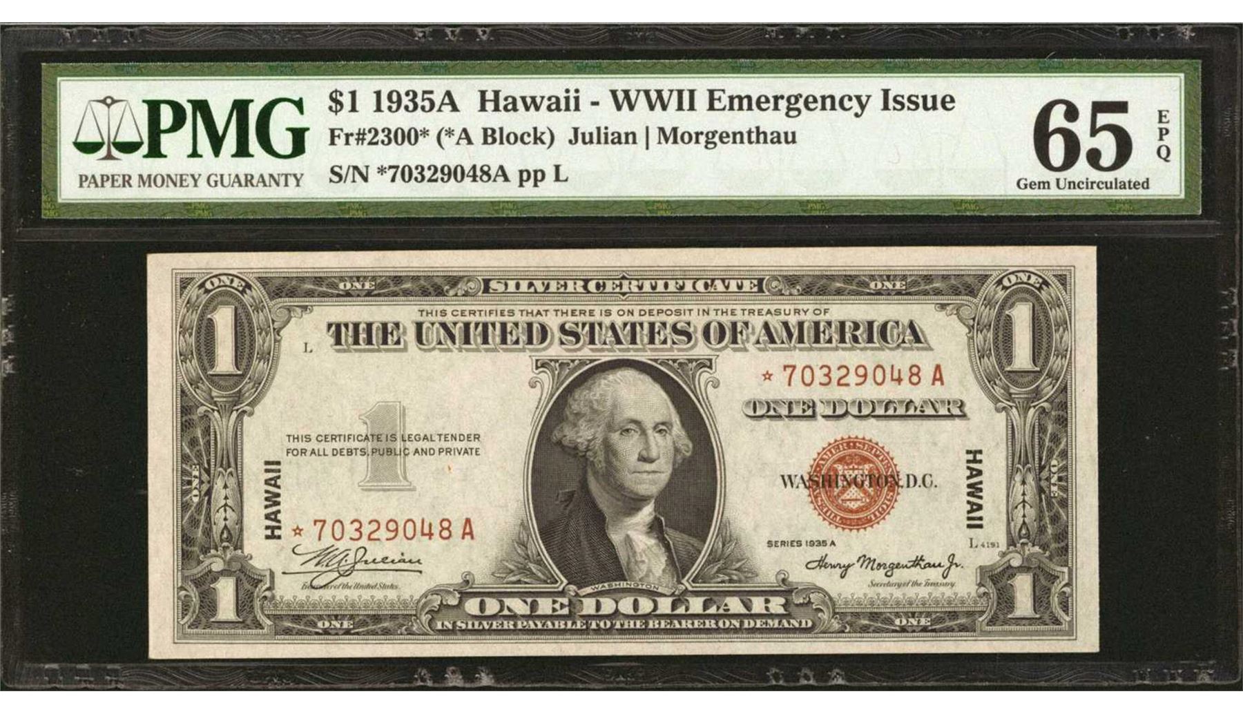 One 1935A $1 Hawaii Silver Certificate WWII Emergency STAR Note PMG Gem Unc. 65EPQ. PMG Certified.