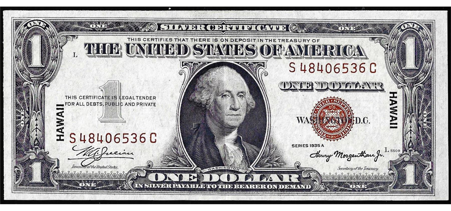 One 1935A $1 Hawaii WWII Emergency Issue Silver Certificate Note.