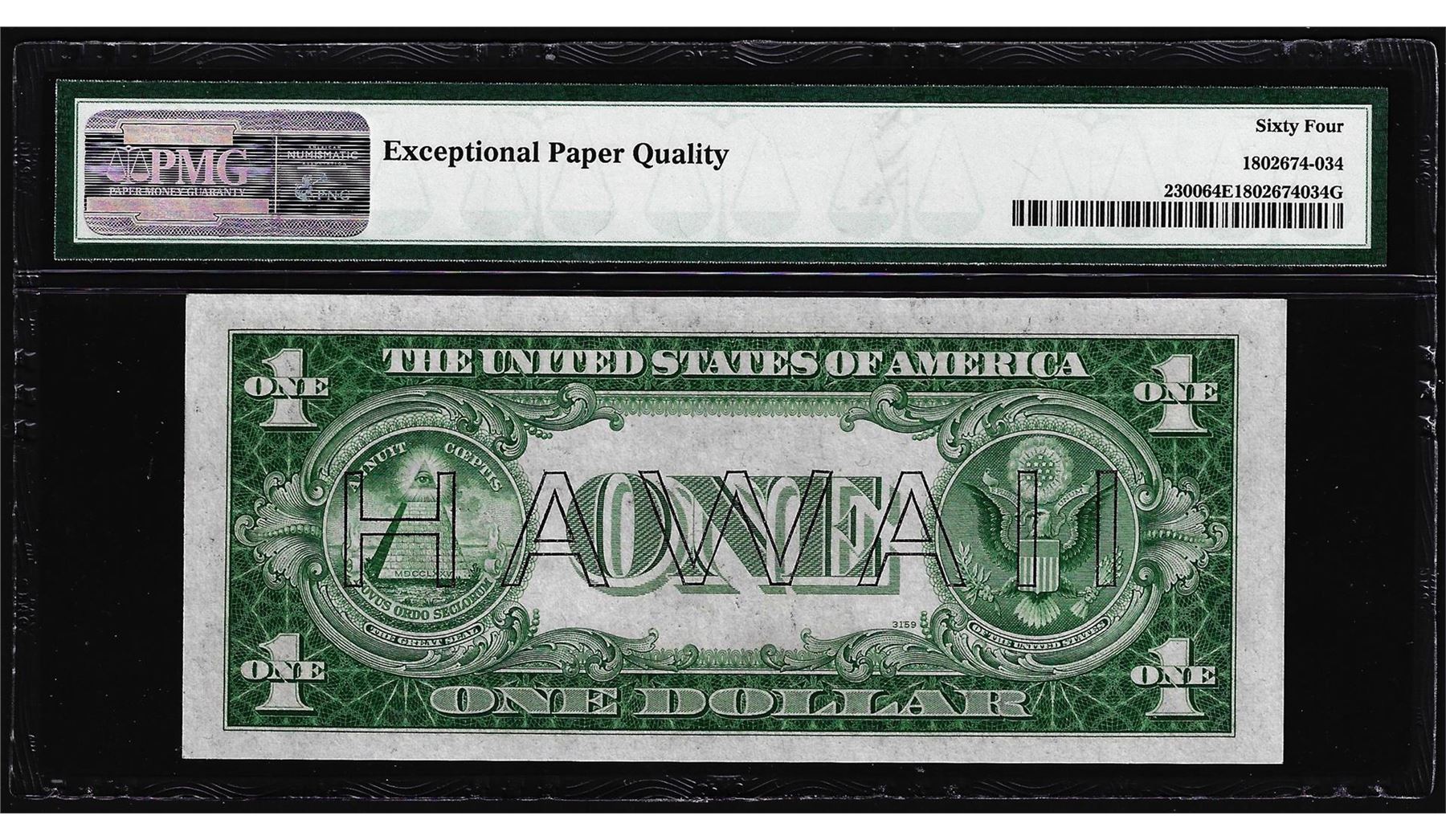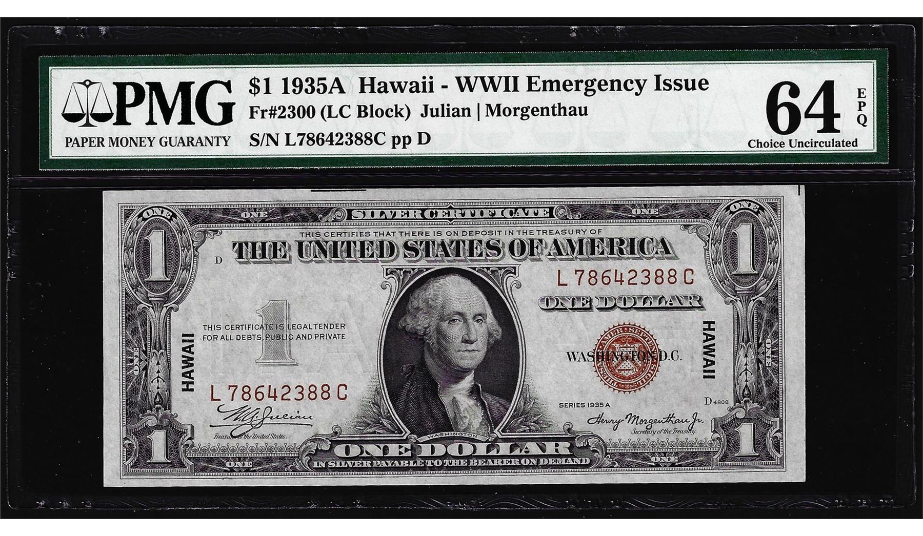 One 1935A $1 Hawaii WWII Emergency Silver Certificate Note PMG Choice Uncirculated 64EPQ. PMG Certified.