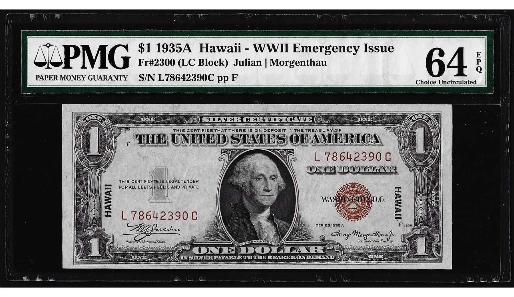 One 1935A $1 Hawaii WWII Emergency Silver Certificate Note PMG Choice Uncirculated 64EPQ. PMG Certified.