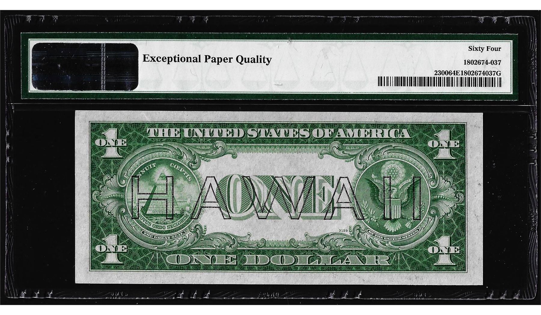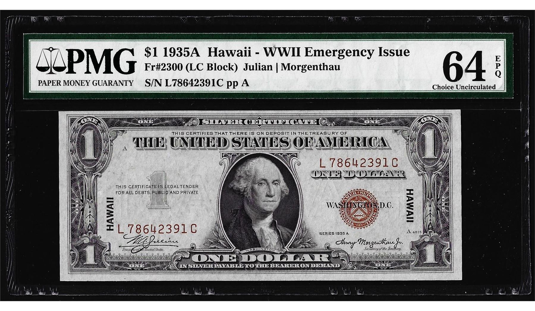 One 1935A $1 Hawaii WWII Emergency Silver Certificate Note PMG Choice Uncirculated 64EPQ. PMG Certified.