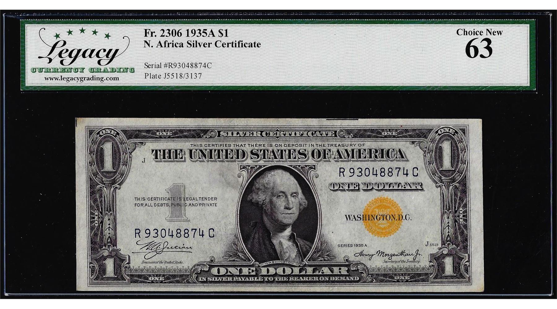 One 1935A $1 North Africa Silver Certificate Note Fr.2306 Legacy Choice New 63. Legacy Graded.