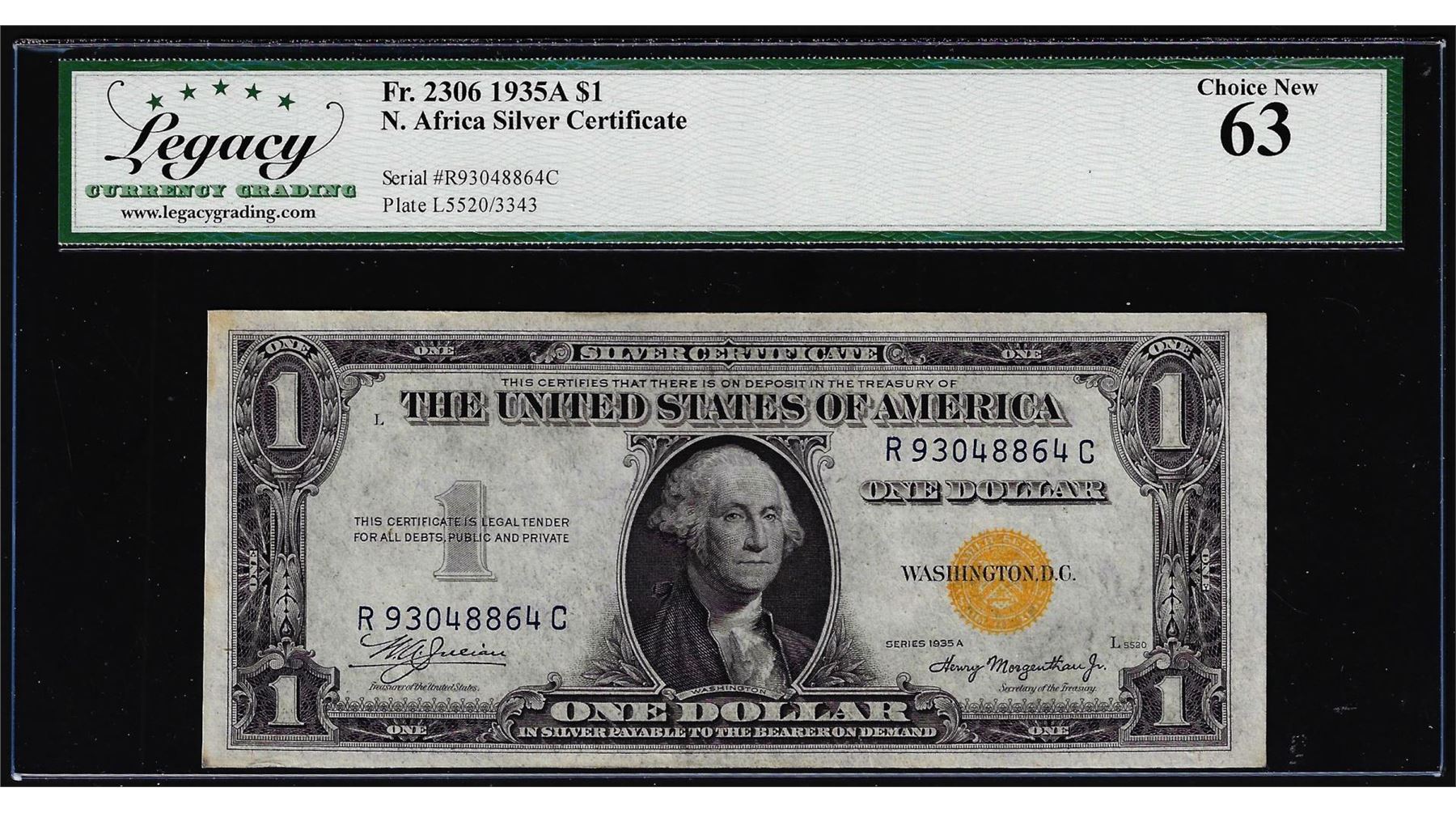 One 1935A $1 North Africa Silver Certificate Note Fr.2306 Legacy Choice New 63. Legacy Graded.