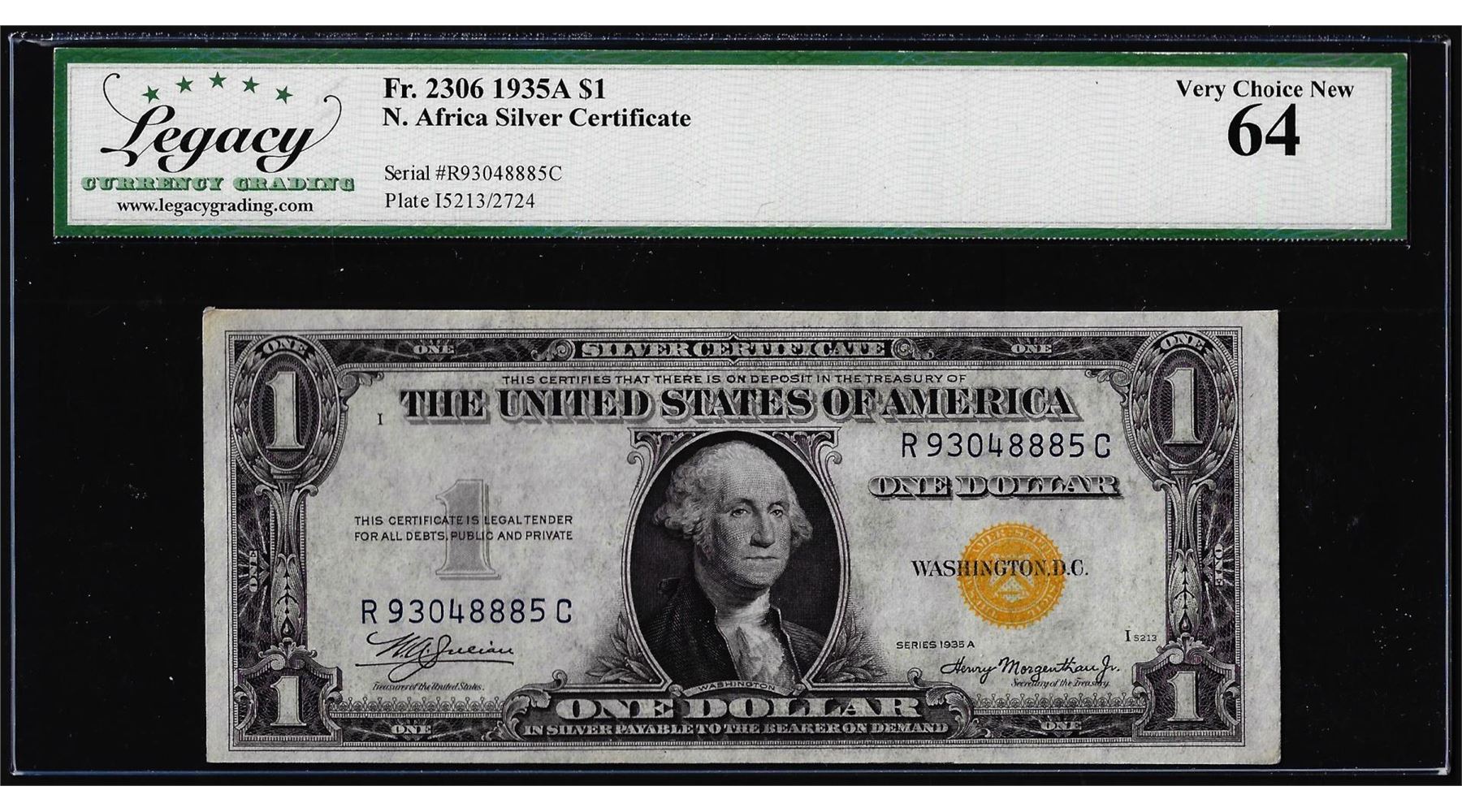 One 1935A $1 North Africa Silver Certificate Note Fr.2306 Legacy Very Choice New 64. Legacy Graded.