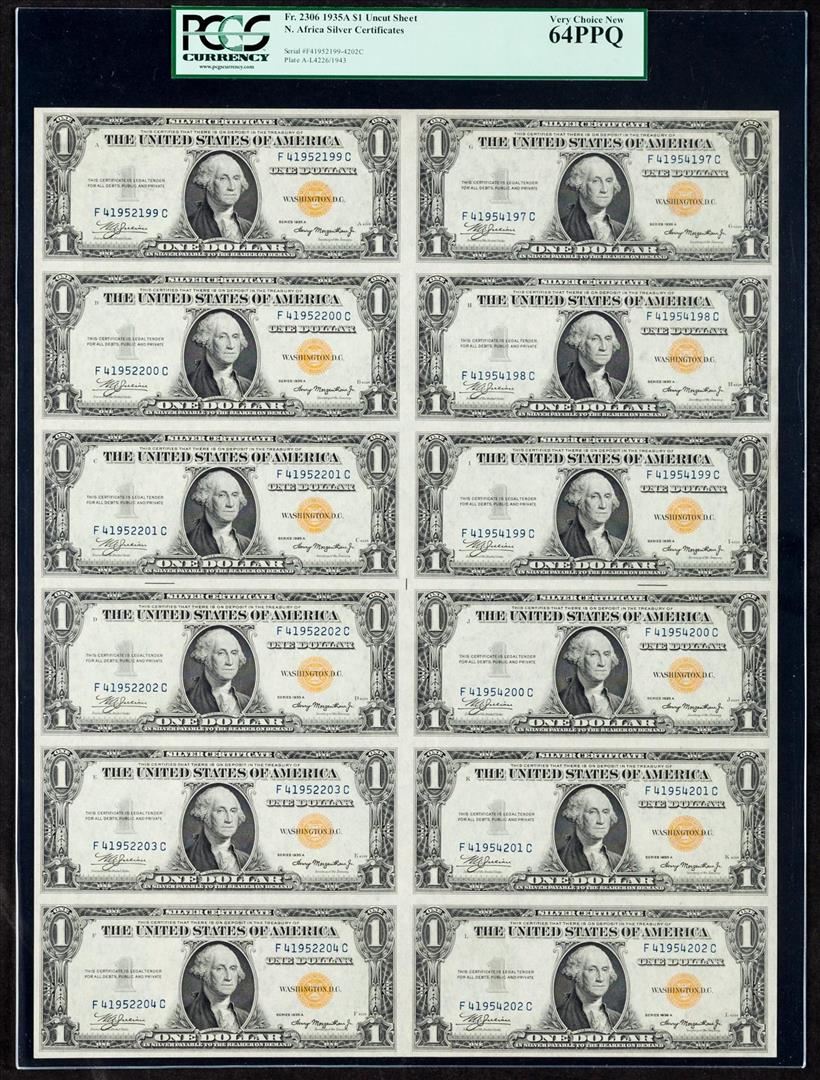 Crispy original paper and bold embossing are present on this wholly original North Africa sheet. The colors are ideal, with decent front to back centering. The serial numbers fall right into the range that all the other North Africa sheets from the F-C bl PCGS Graded.
