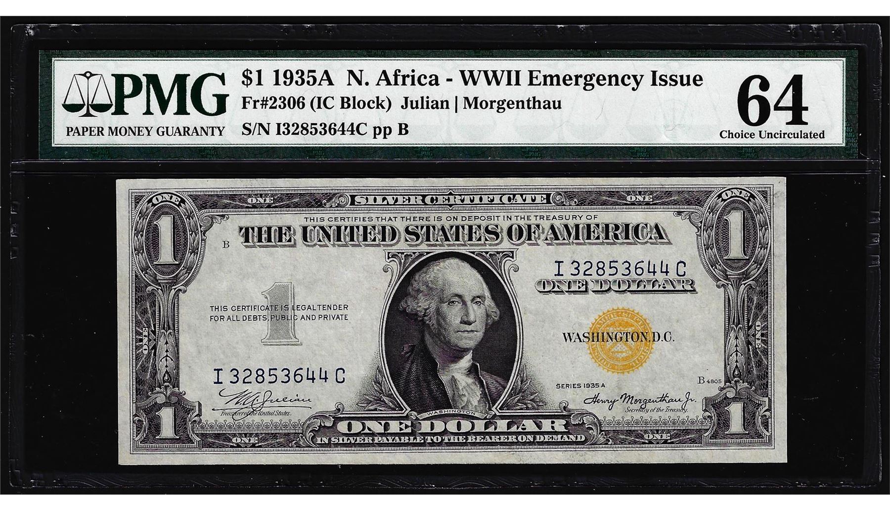 One 1935A $1 North Africa Silver Certificate WWII Emergency Note PMG Ch. Uncirculated 64. PMG Certified.