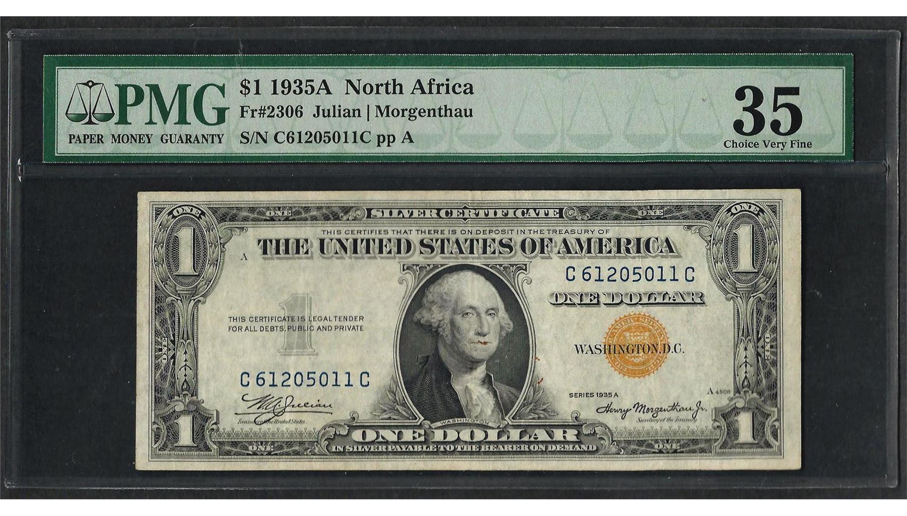 One 1935A $1 North Africa Silver Certificate WWII Emergency Note PMG Choice Very Fine 35. PMG Certified.