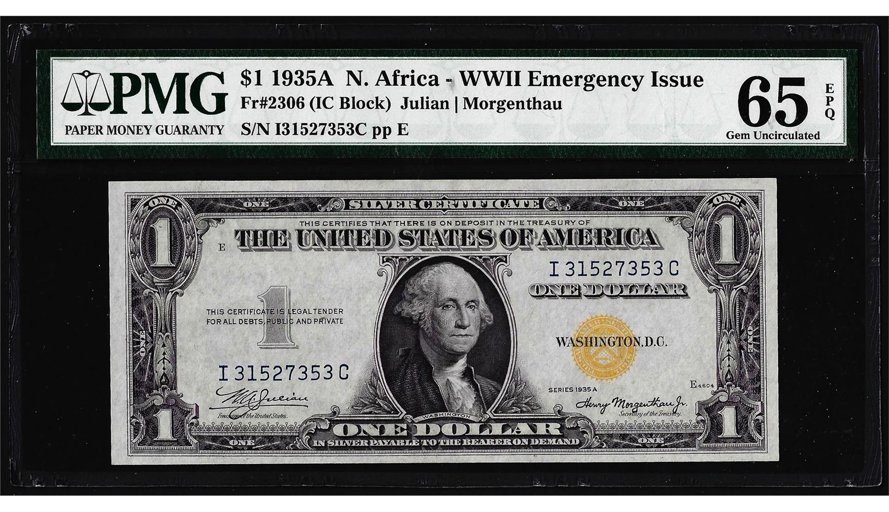 One 1935A $1 North Africa Silver Certificate WWII Emergency Note PMG Gem Unc. 65EPQ. PMG Certified.