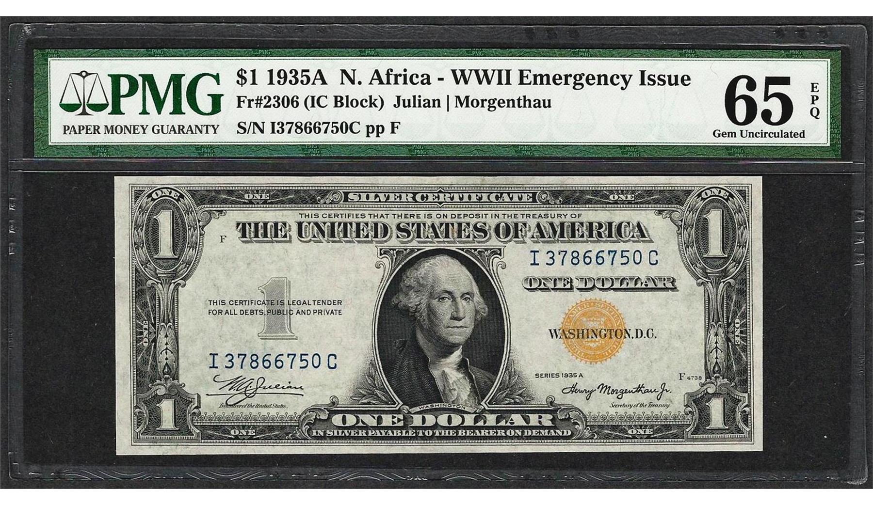 One 1935A $1 North Africa Silver Certificate WWII Emergency Note PMG Gem Unc. 65EPQ. PMG Certified.