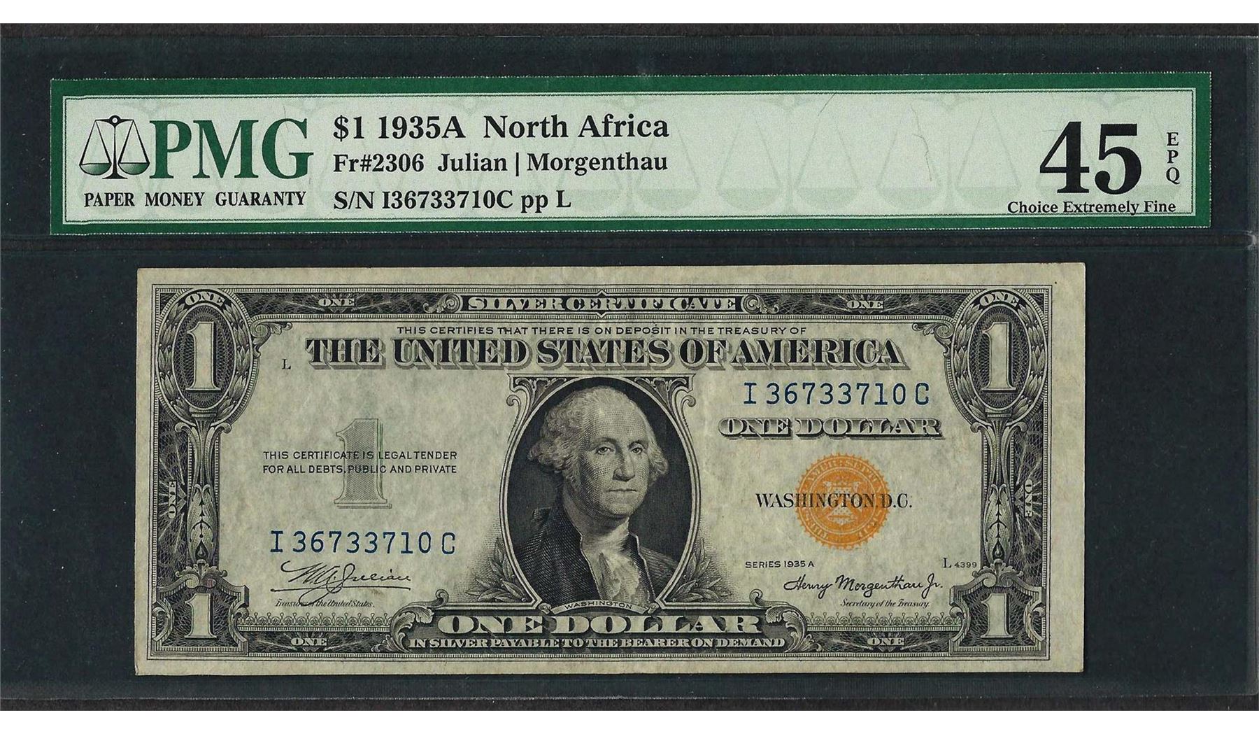 One 1935A $1 North Africa Silver Certificate WWII Note PMG Choice Extremely Fine 45EPQ. PMG Certified.