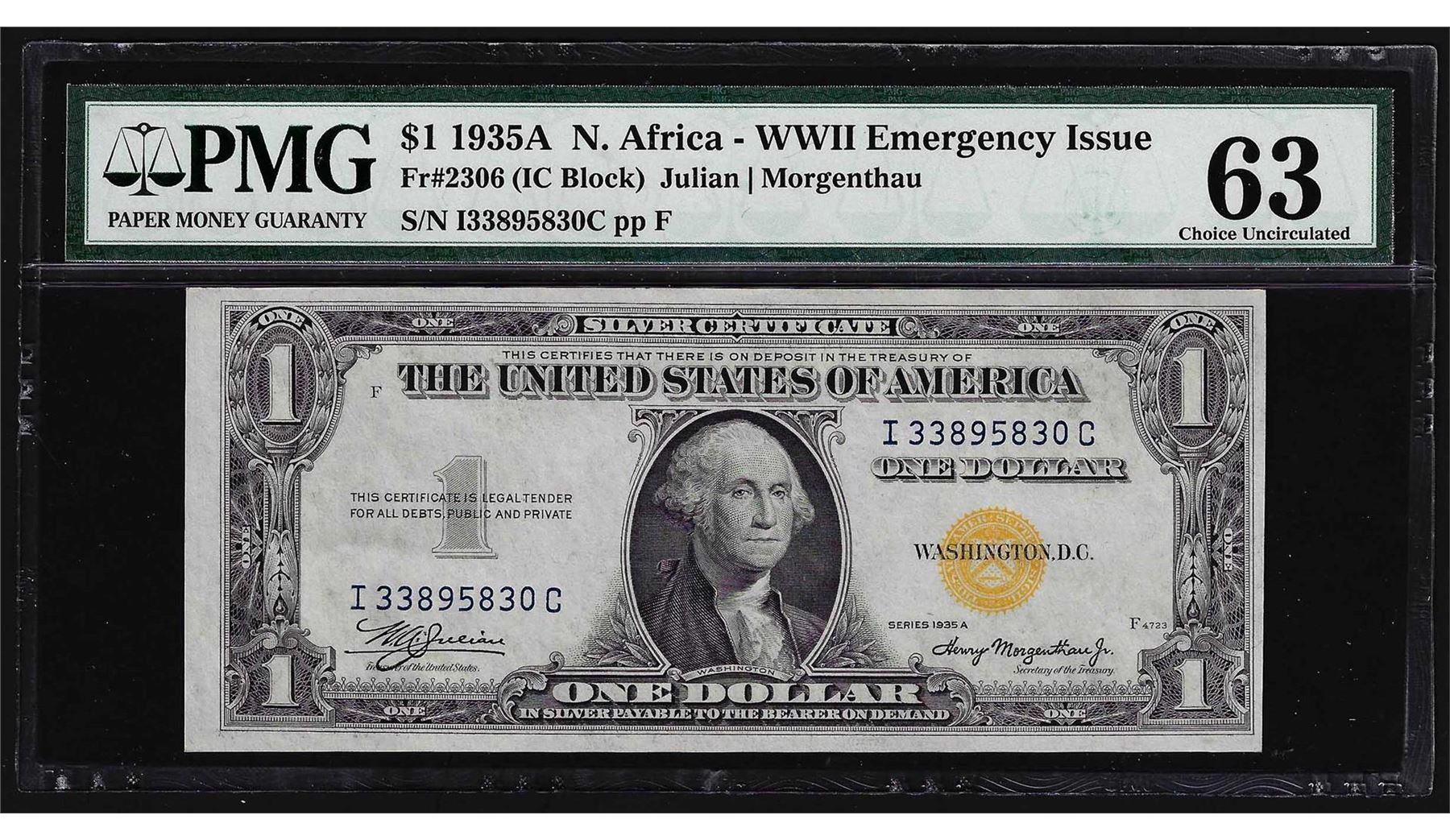 One 1935A $1 North Africa WWII Emergency Silver Certificate Note PMG CU63. PMG Certified.