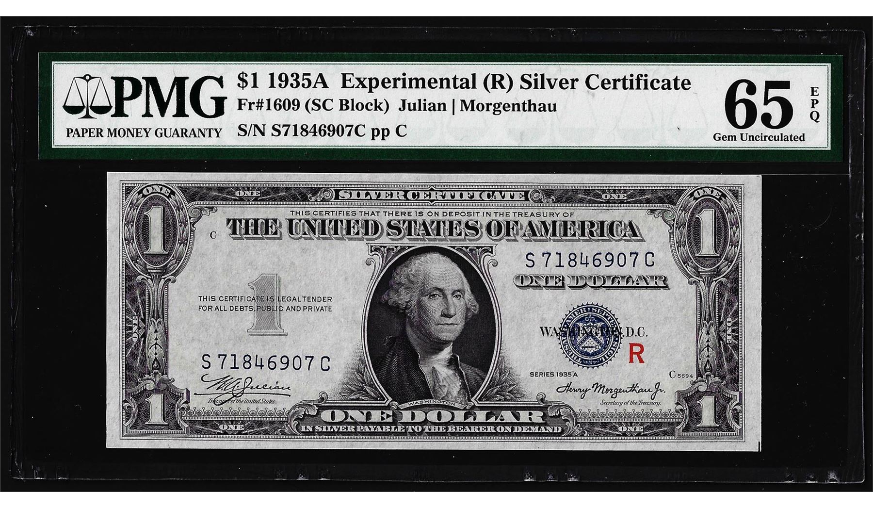 One 1935A $1 Silver Certificate Experimental "R" Fr.1609 PMG Gem Uncirculated 65EPQ. PMG Certified.