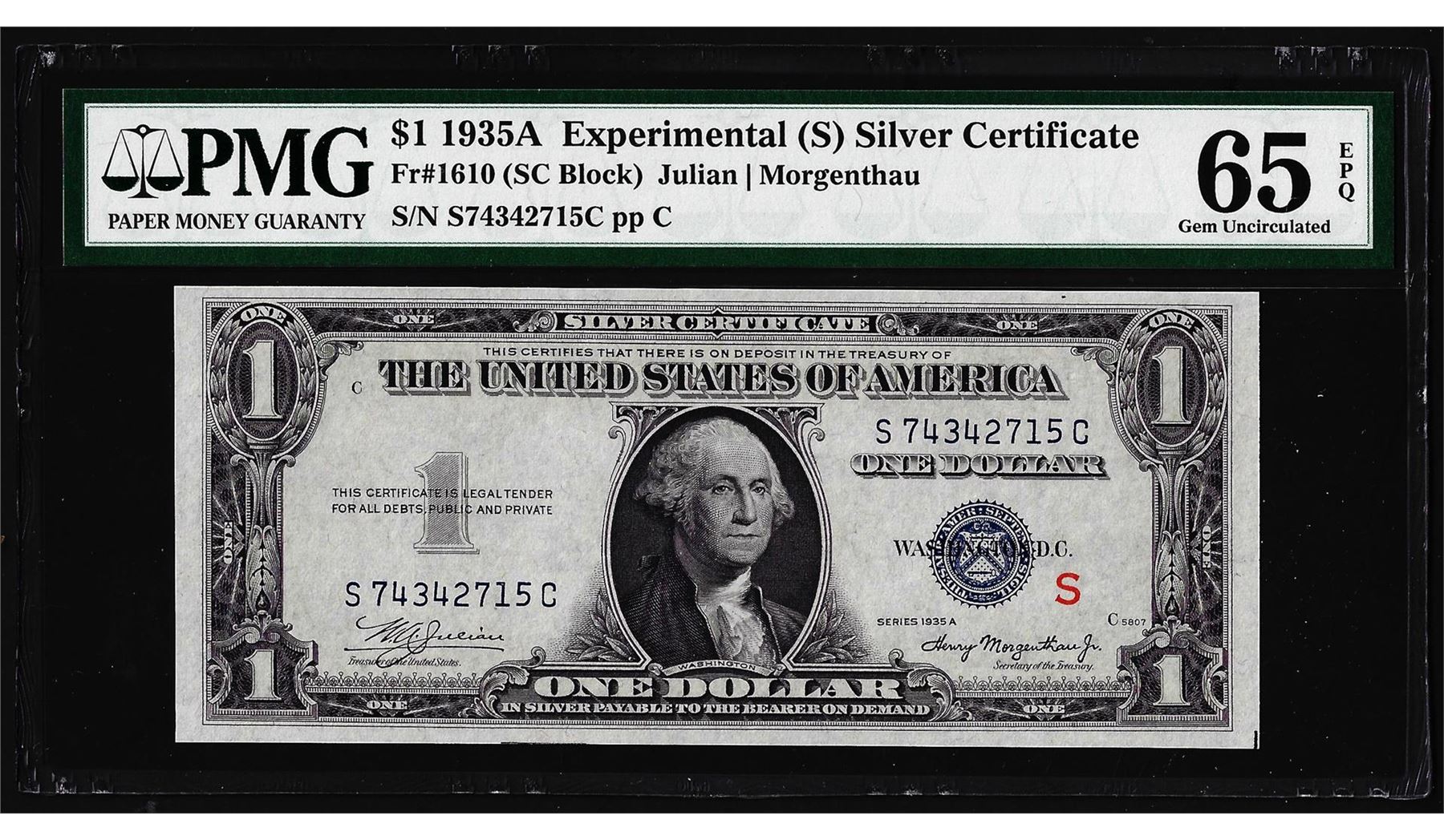 One 1935A $1 Silver Certificate Experimental "S" Fr.1610 PMG Gem Uncirculated 65EPQ. PMG Certified.