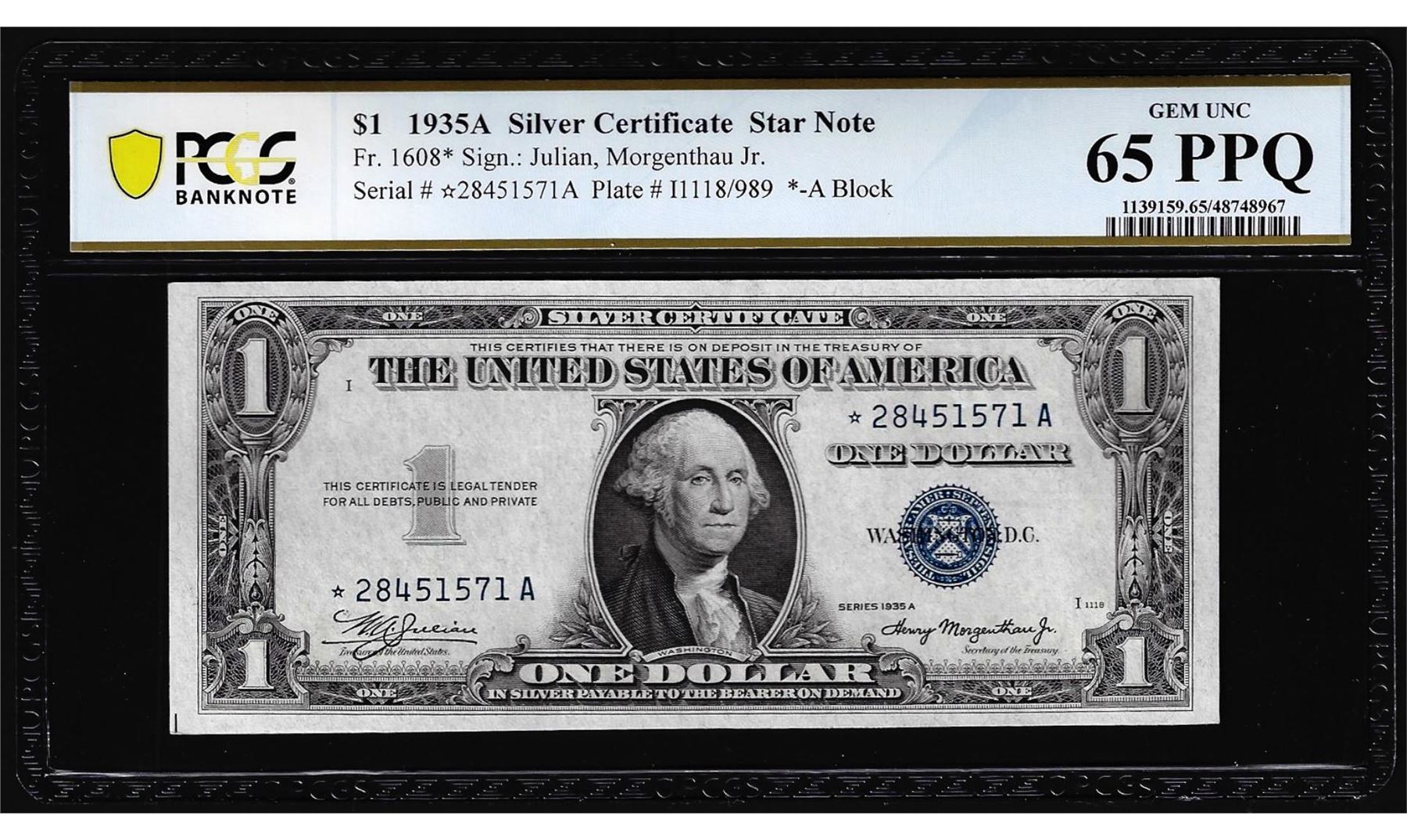 One 1935A $1 Silver Certificate STAR Note Fr.1608* PCGS Gem Uncirculated 65PPQ. PCGS Graded.