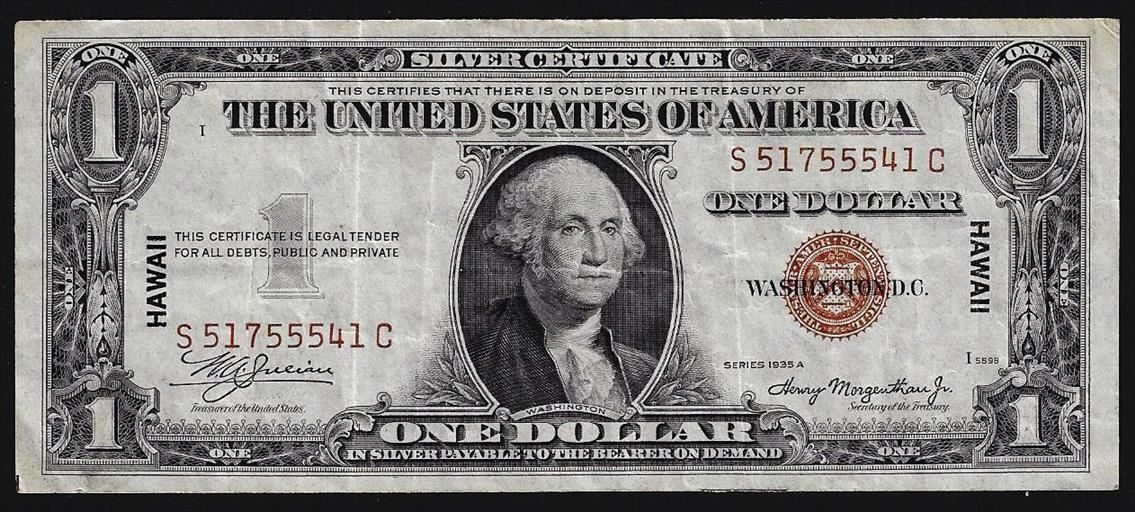 One 1935A $1 Silver Certificate WWII Emergency Hawaii Note.
