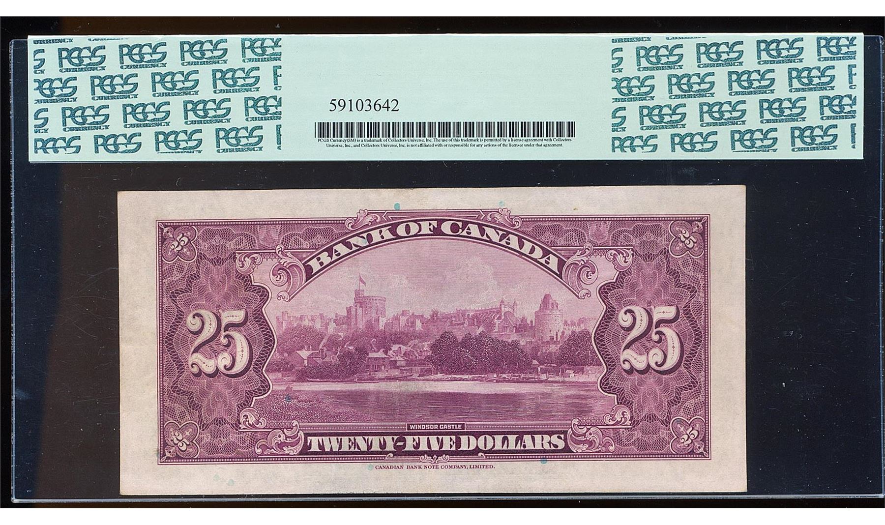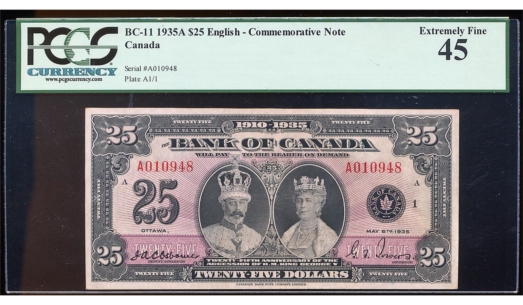 One 1935A $25 Bank of Canada English Commemorative Note BC-11 PCGS Graded Extremely Fine 45. This denomination was not part of the regular Series of 1935 issue, but was printed as a special commemorative tribute marking the 25th anniversary of H.M. King George V's accession to the throne. 140,000 English Text examples were printed, along with 20,000 pieces bearing the text in French. The entire issue was in circulation for only two years, as the Bank of Canada in May of 1937, chose to cancel all new $25 notes and redeem those already in circulation. Of the 160,000 pieces issued in both languages, a total of only 1,840 were outstanding by 2006. PCGS Graded.