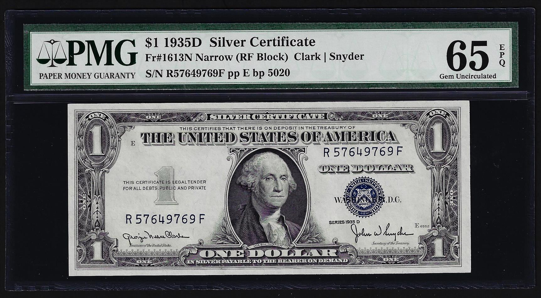 One 1935D $1 Silver Certificate Note Narrow PMG Gem Uncirculated 65EPQ. PMG Certified.