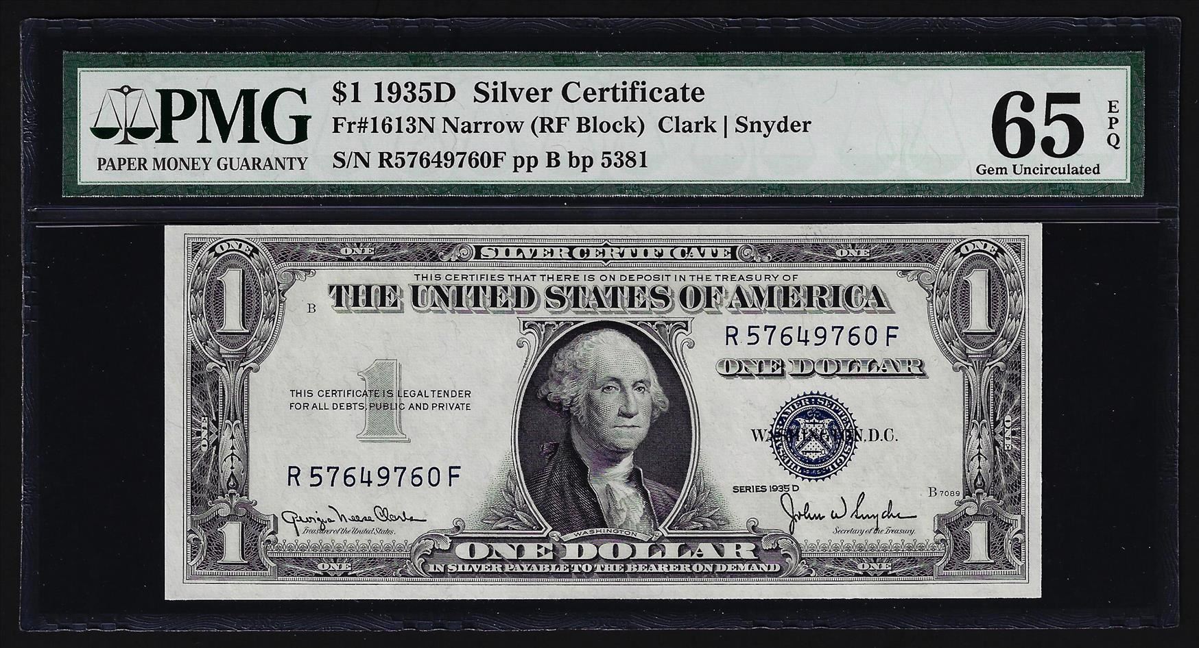 One 1935D $1 Silver Certificate Note Narrow PMG Gem Uncirculated 65EPQ. PMG Certified.