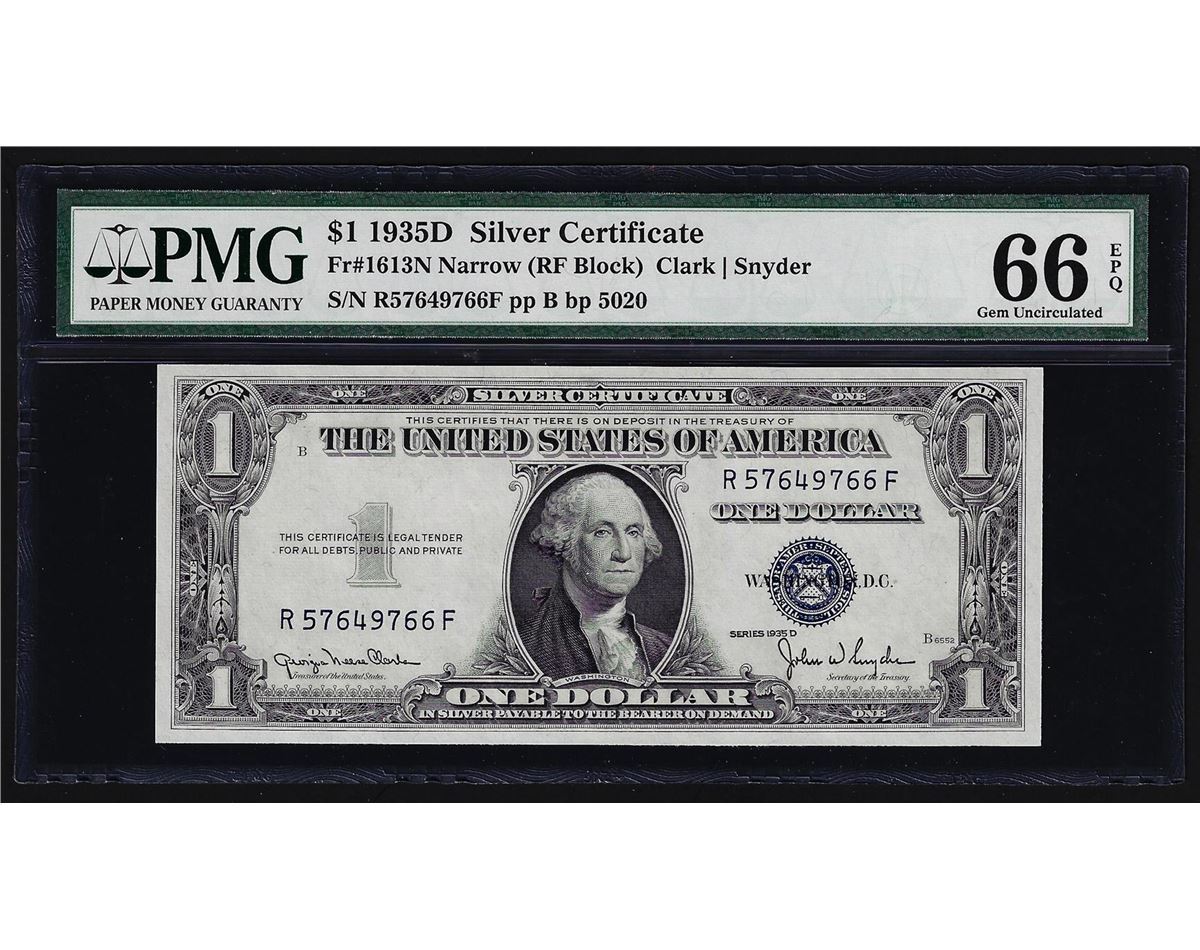 One 1935D $1 Silver Certificate Note Narrow PMG Gem Uncirculated 66EPQ. PMG Certified.