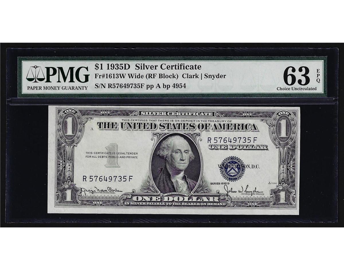 One 1935D $1 Silver Certificate Note Wide PMG Choice Uncirculated 63EPQ. PMG Certified.