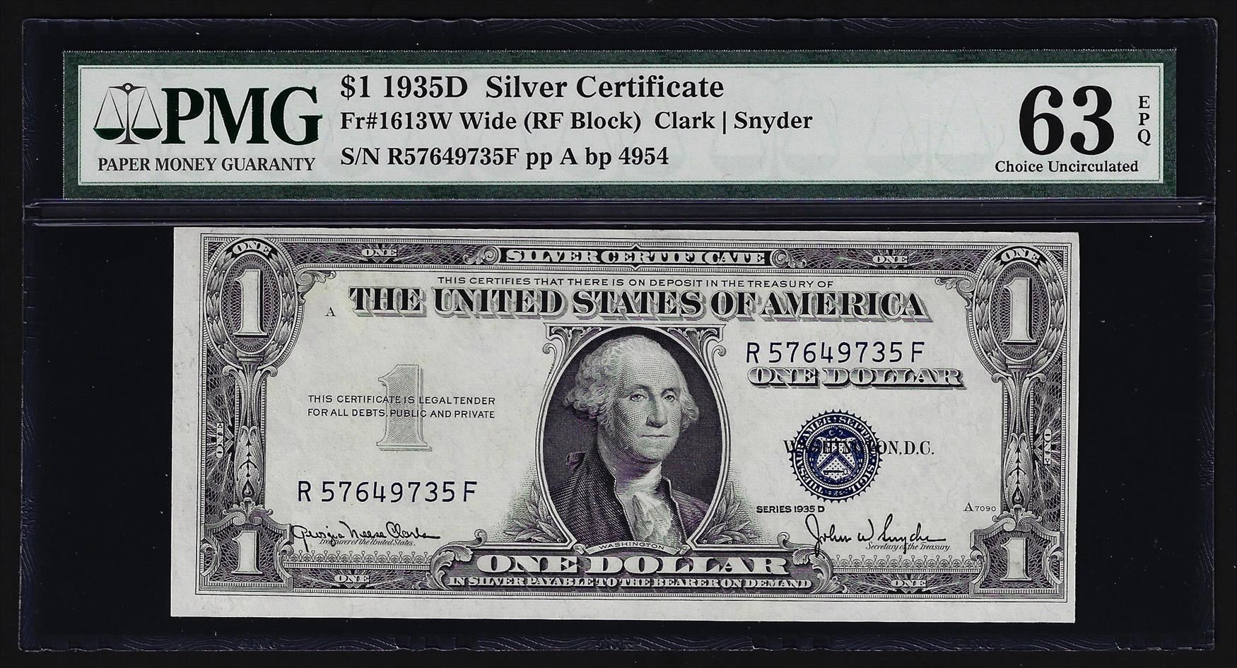 One 1935D $1 Silver Certificate Note Wide PMG Choice Uncirculated 63EPQ. PMG Certified.
