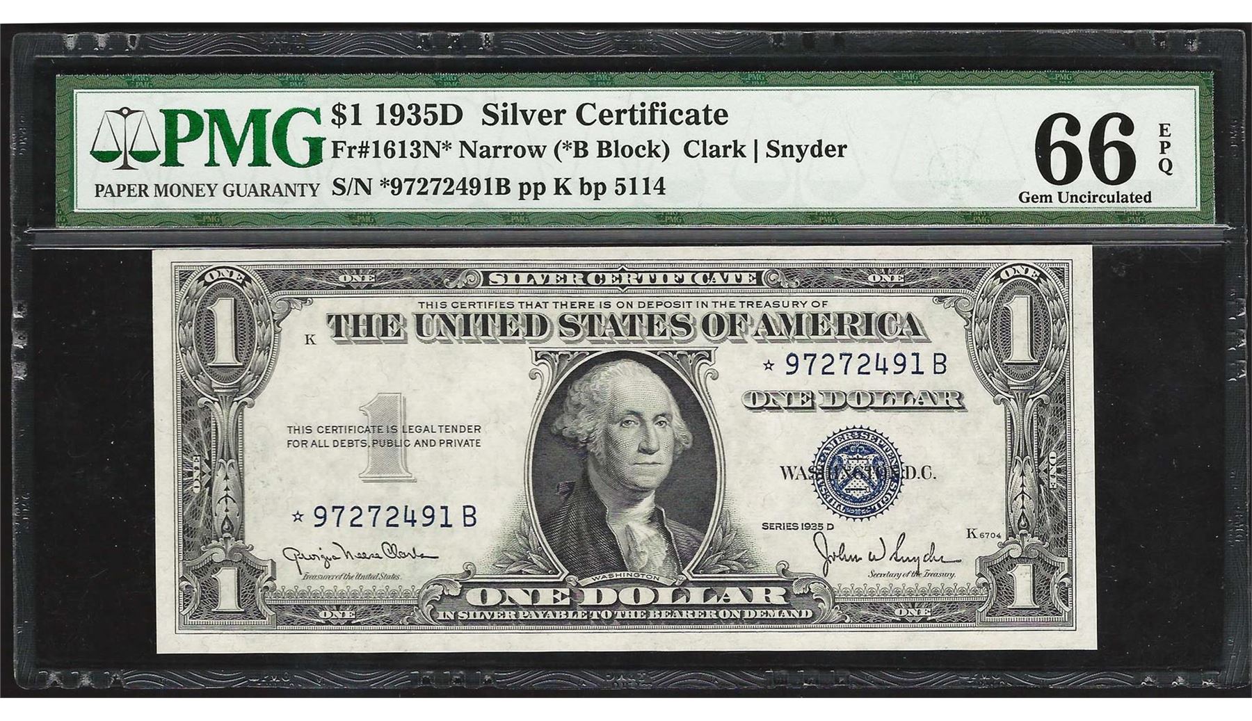 One 1935D $1 Silver Certificate STAR Note Fr.1613N* PMG Gem Uncirculated 66EPQ. PMG Certified.