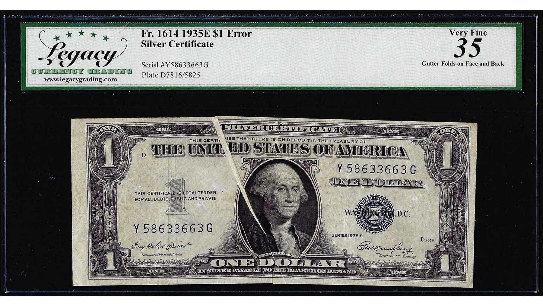 One 1935E $1 Federal Reserve Note Gutter Fold Error FR.1614 Legacy Very Fine 35. Legacy Graded.