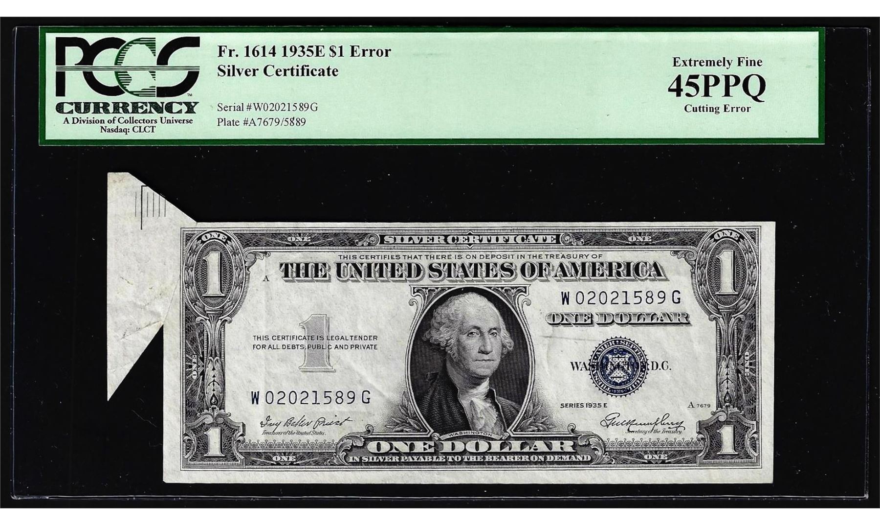 One 1935E $1 Silver Certificate Note Cutting Error Fr.1614 PCGS Extremely Fine 45PPQ. PCGS Graded.