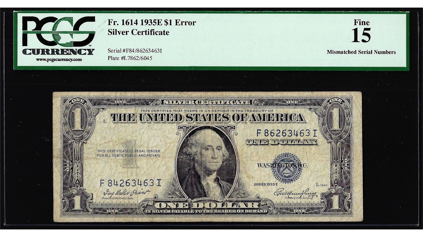 One 1935E $1 Silver Certificate Note Fr.1614 Mismatched Serial Number Error PCGS Fine 15. PCGS Graded.