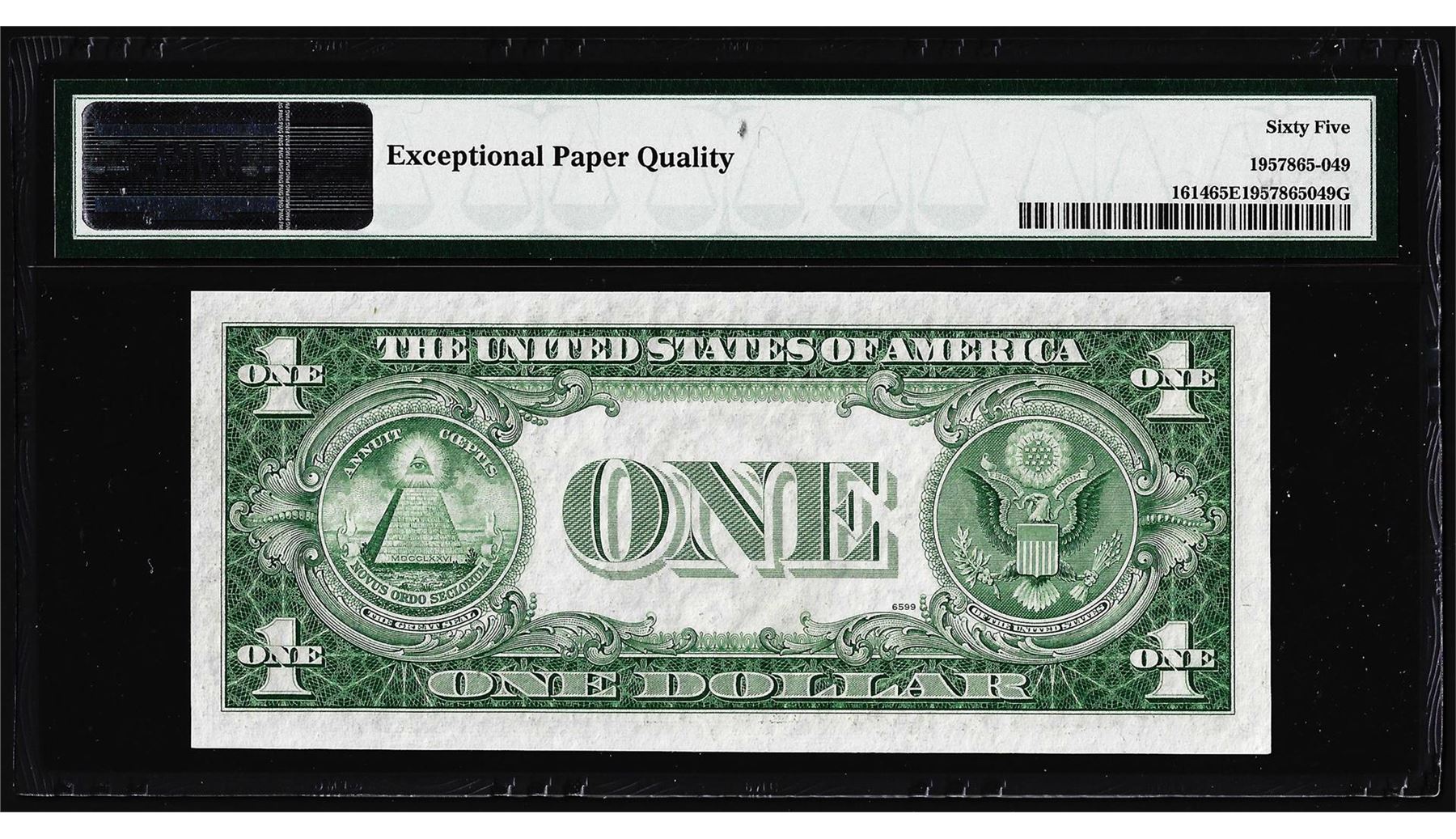 One 1935E $1 Silver Certificate Note Fr.1614 PMG Gem Uncirculated 65EPQ Low Serial Number. PMG Certified.