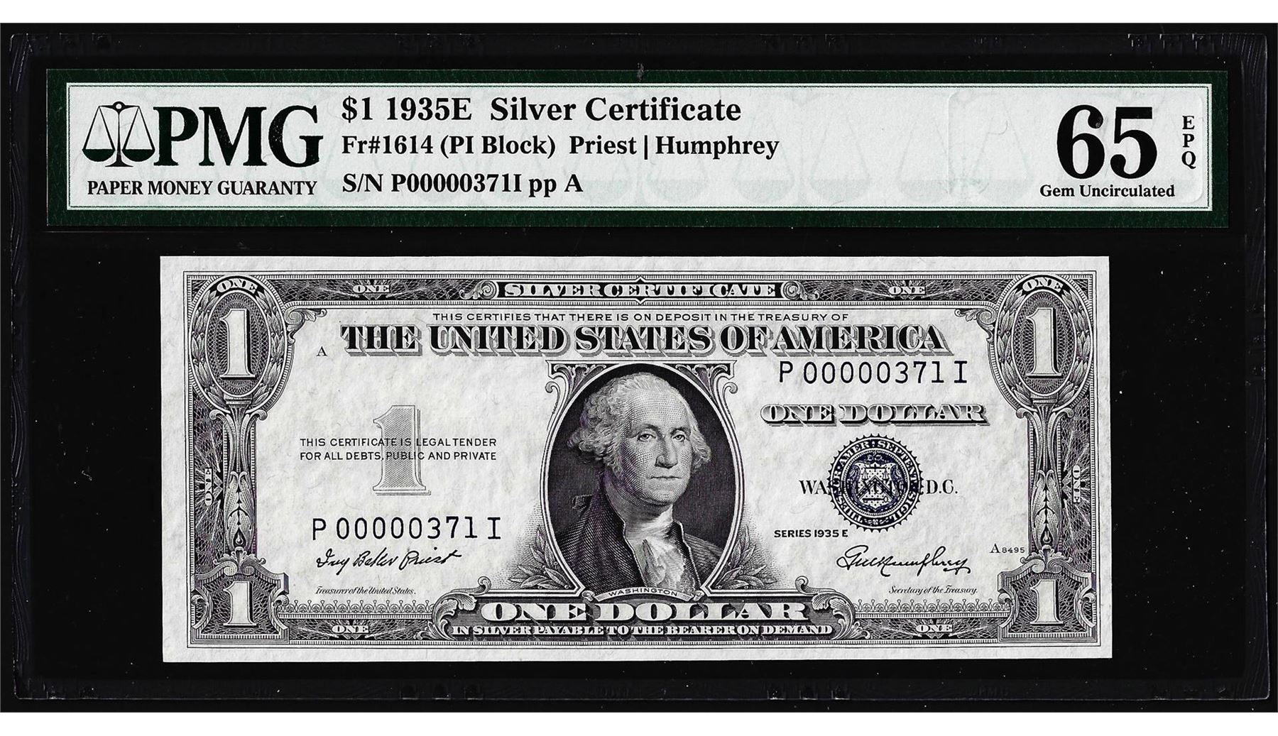One 1935E $1 Silver Certificate Note Fr.1614 PMG Gem Uncirculated 65EPQ Low Serial Number. PMG Certified.