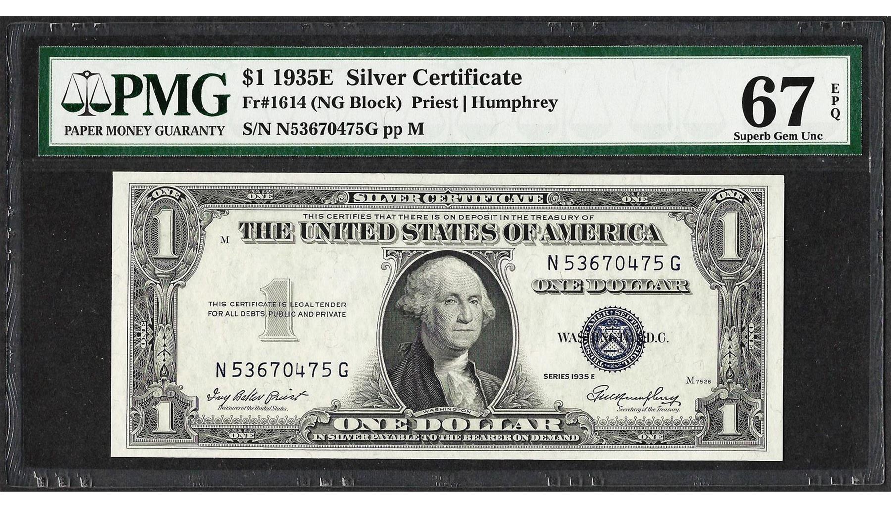 One 1935E $1 Silver Certificate Note Fr.1614 PMG Superb Gem Uncirculated 67EPQ. PMG Certified.