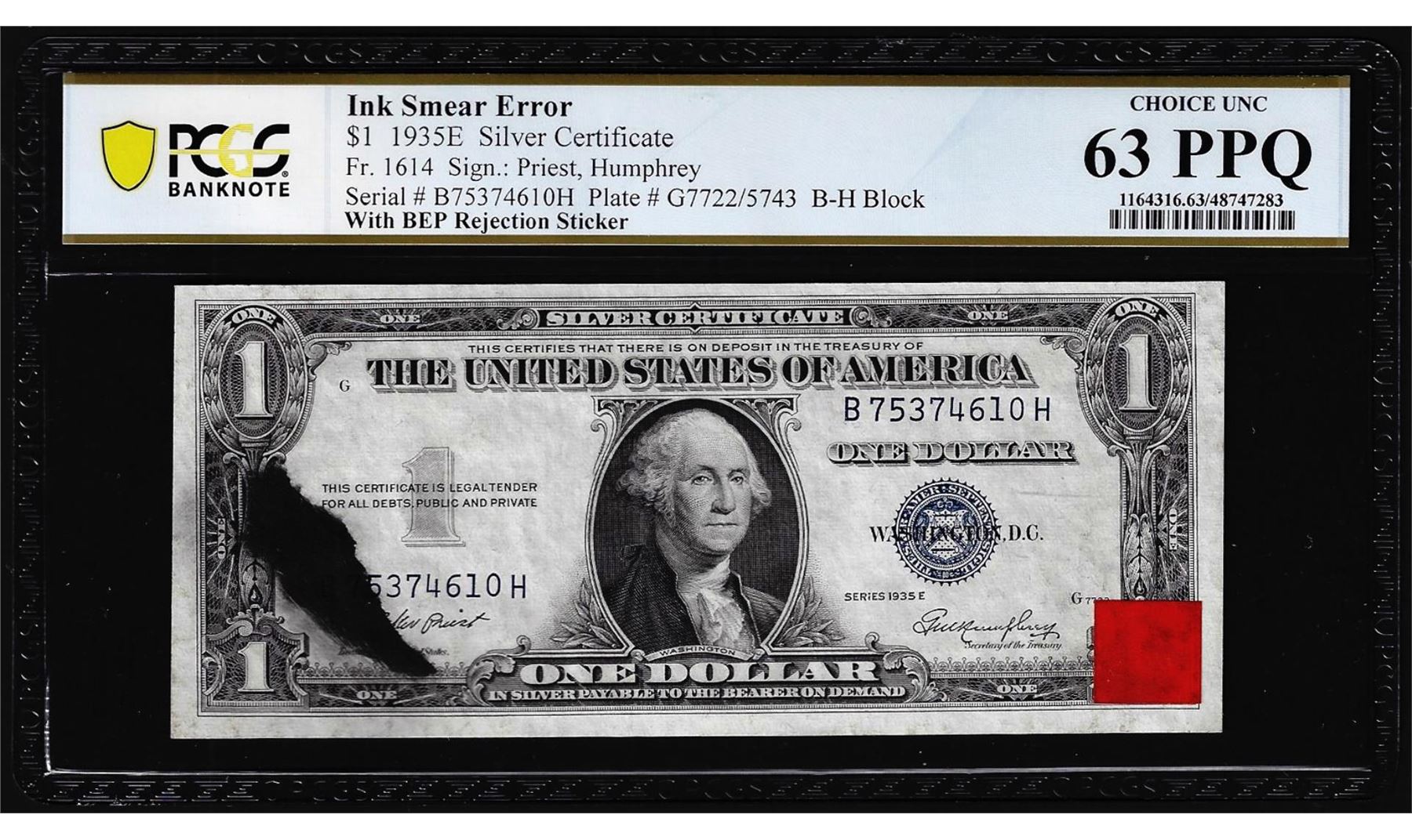 One 1935E $1 Silver Certificate Note Ink Smear Error PCGS Choice Unc 63PPQ w/BEP Sticker. PCGS Graded.