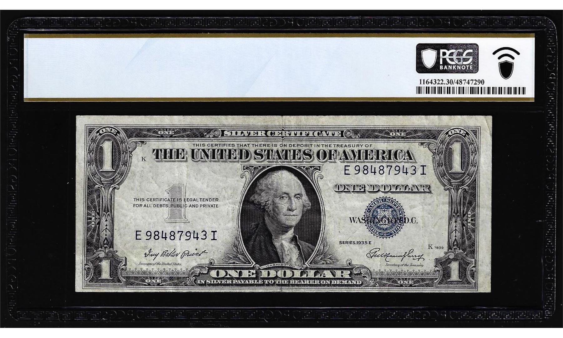One 1935E $1 Silver Certificate Note Inverted Back Error Fr.1614 PCGS Very Fine 30. PCGS Graded.