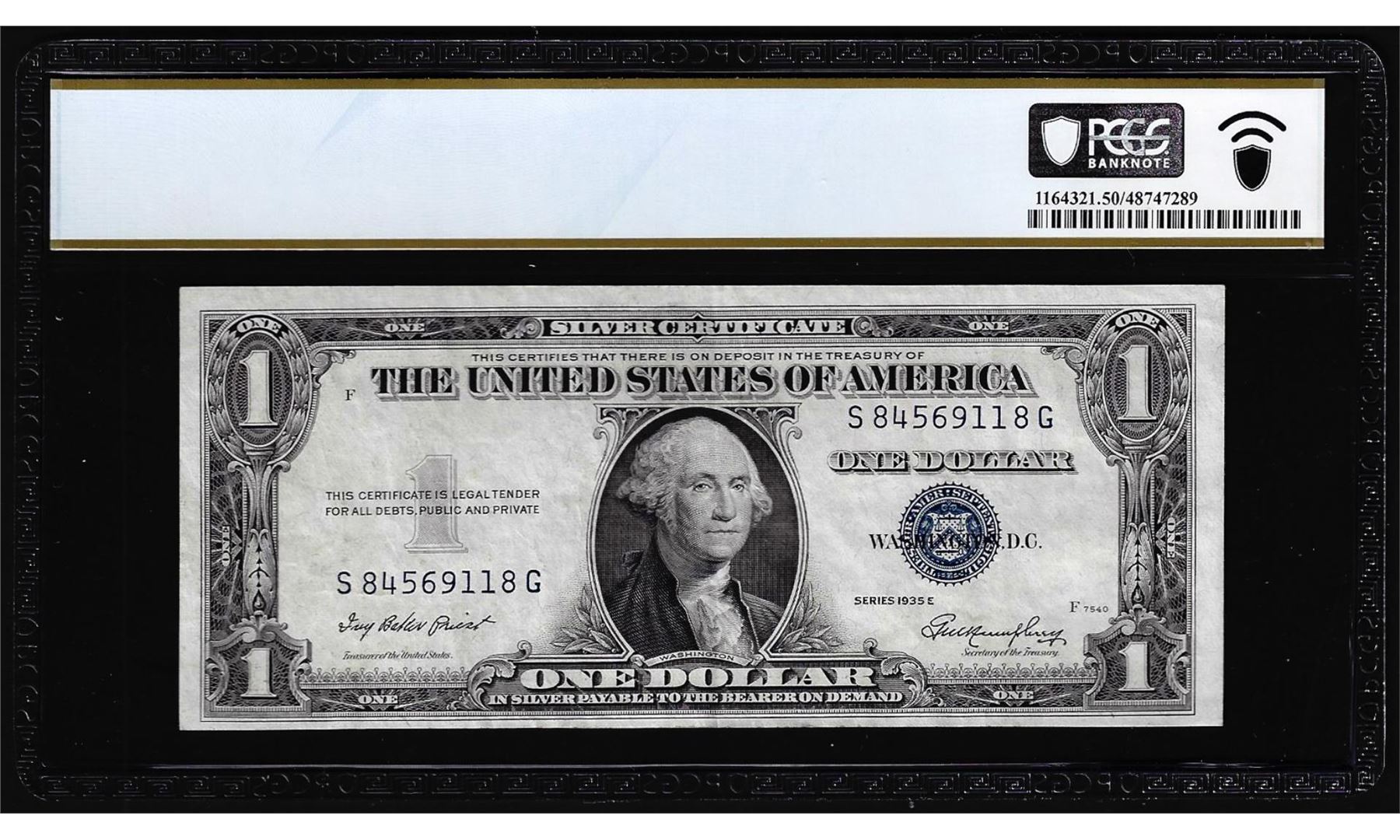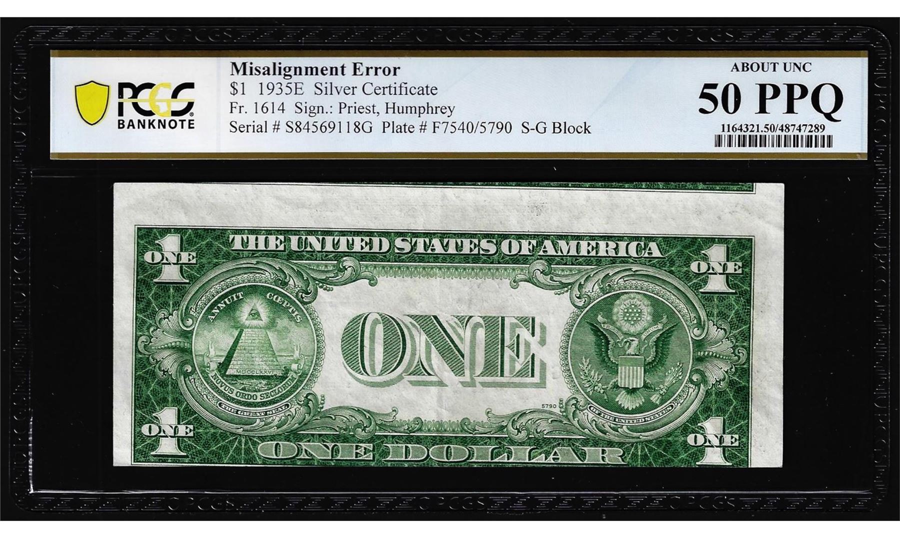 One 1935E $1 Silver Certificate Note Misalignment Error Fr.1614 PCGS About Unc 50PPQ. PCGS Graded.