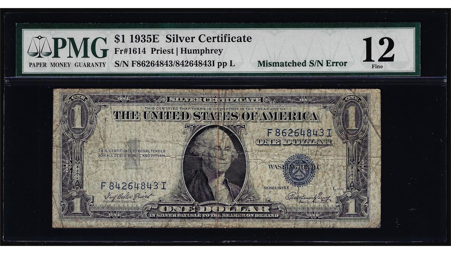 One 1935E $1 Silver Certificate Note Mismatched Serial Number Error Fr.1614 PMG Fine 12. PMG Certified.