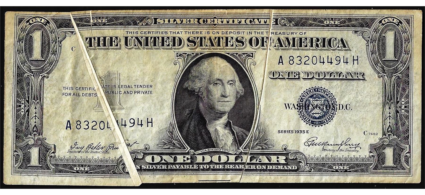 One 1935E $1 Silver Certificate Note Multiple Gutter Fold Errors.