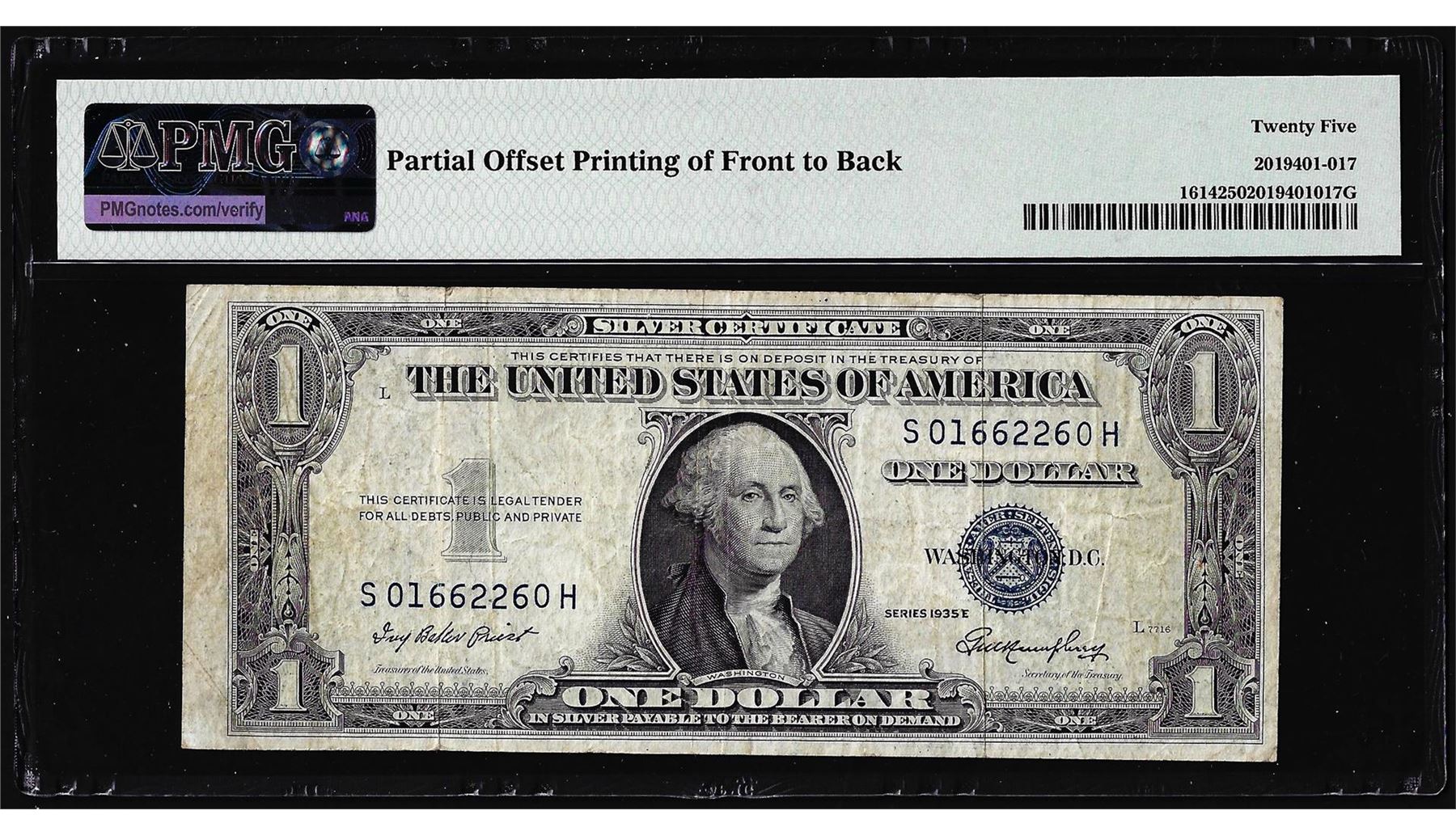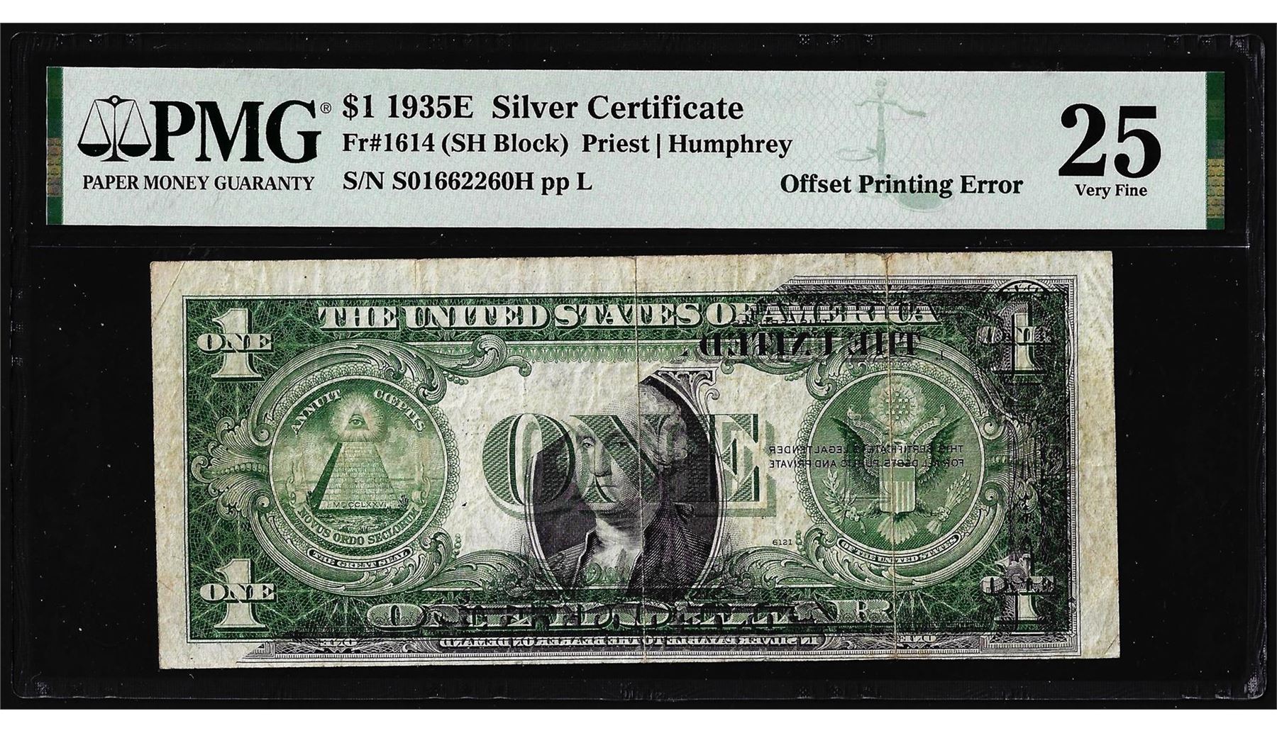 One 1935E $1 Silver Certificate Note Offset Printing Error Fr.1614 PMG Very Fine 25. PMG Certified.