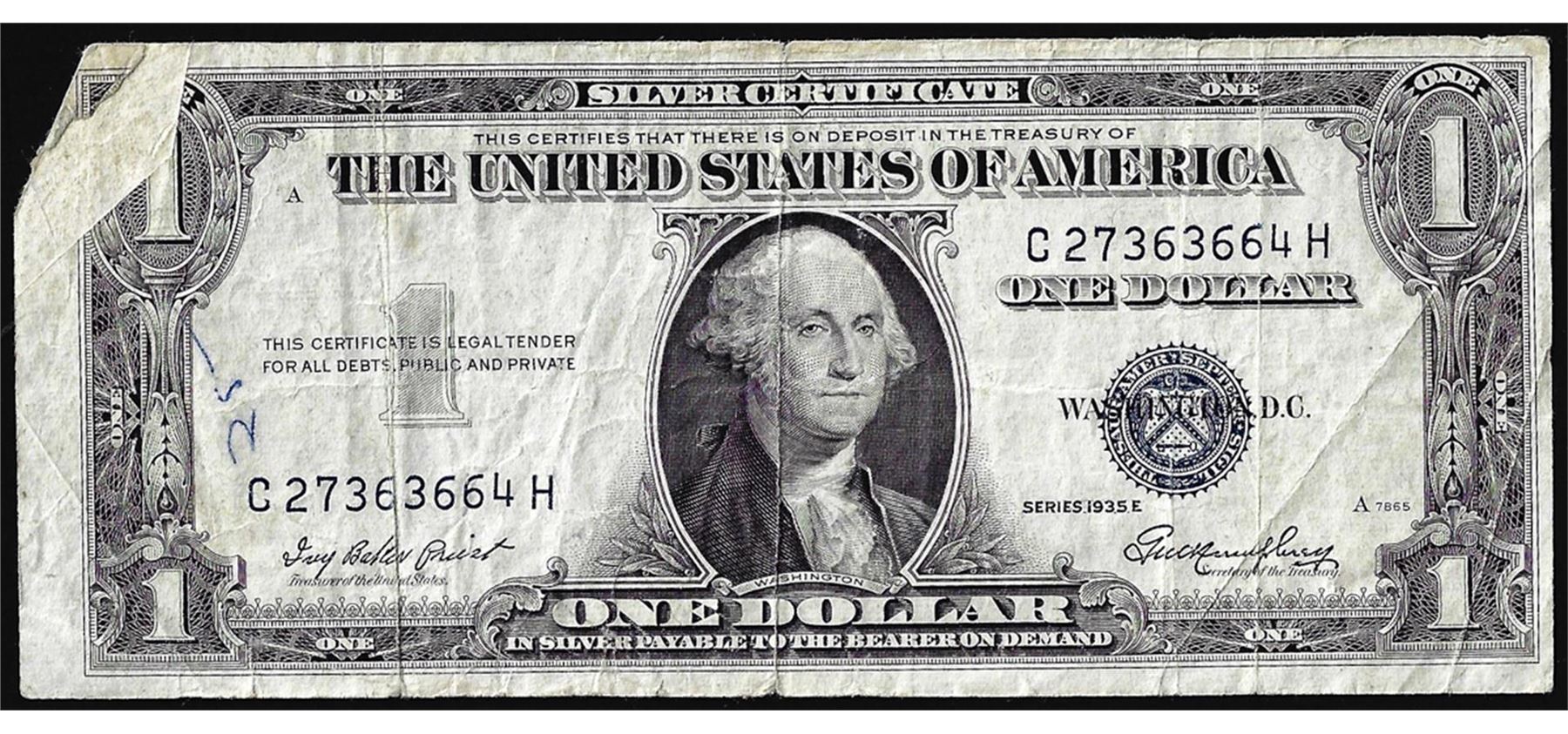 One 1935E $1 Silver Certificate Note Printed Fold Over ERROR.
