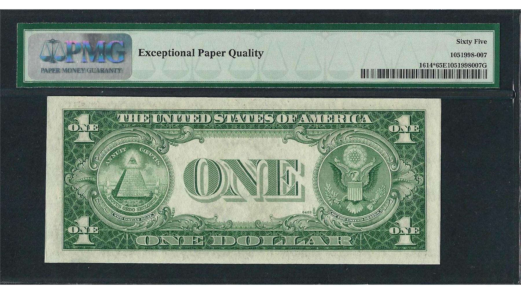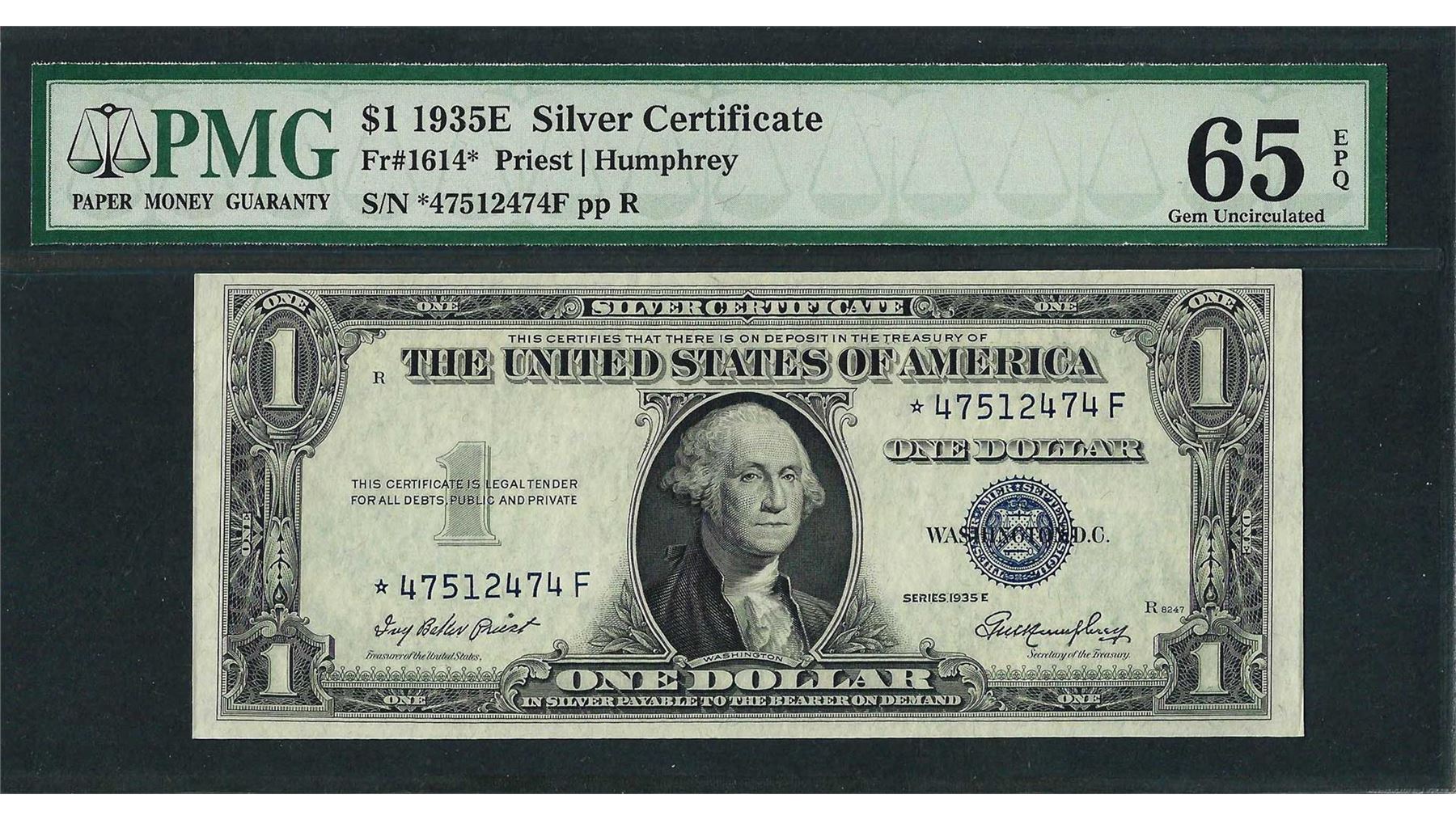 One 1935E $1 Silver Certificate STAR Note Fr.1614* PMG Gem Uncirculated 65EPQ. PMG Certified.
