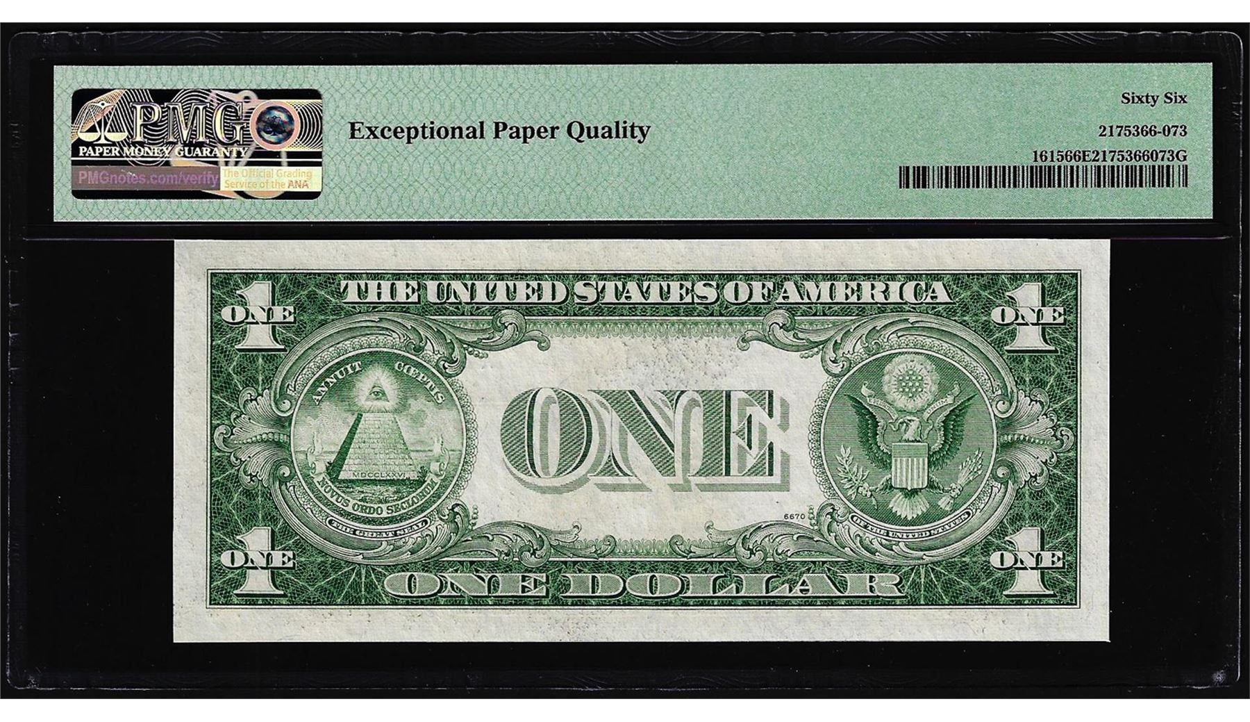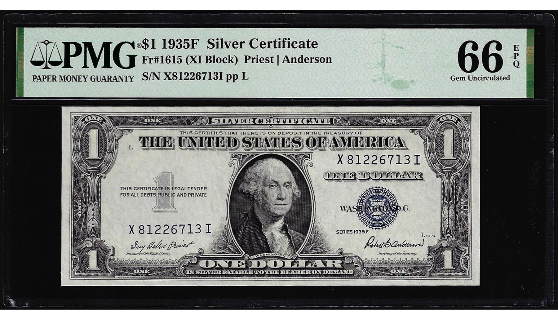 One 1935F $1 Silver Certificate Note Fr.1615 PMG Gem Uncirculated 66EPQ. PMG Certified.
