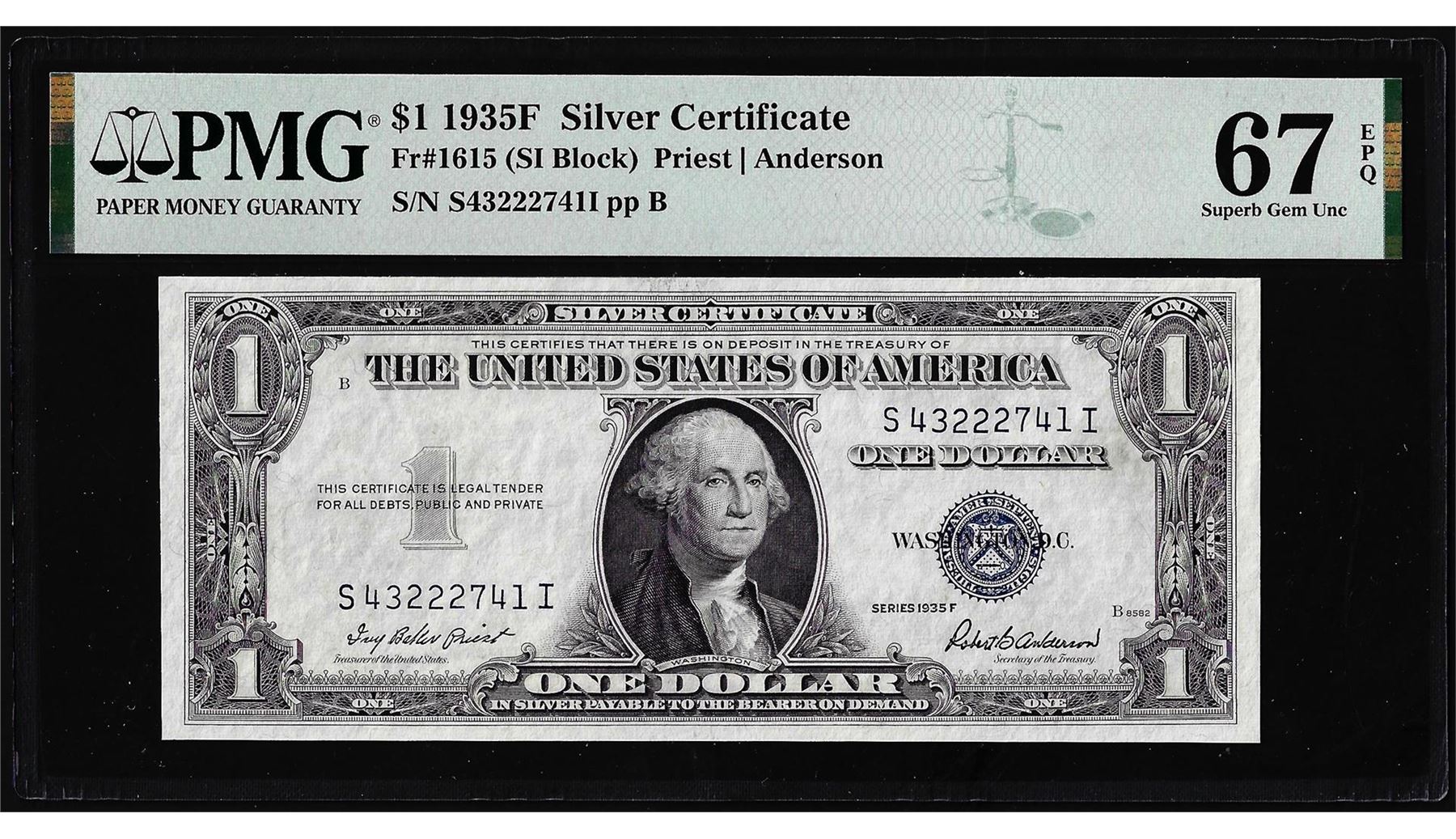One 1935F $1 Silver Certificate Note Fr.1615 PMG Superb Gem Uncirculated 67EPQ. PMG Certified.